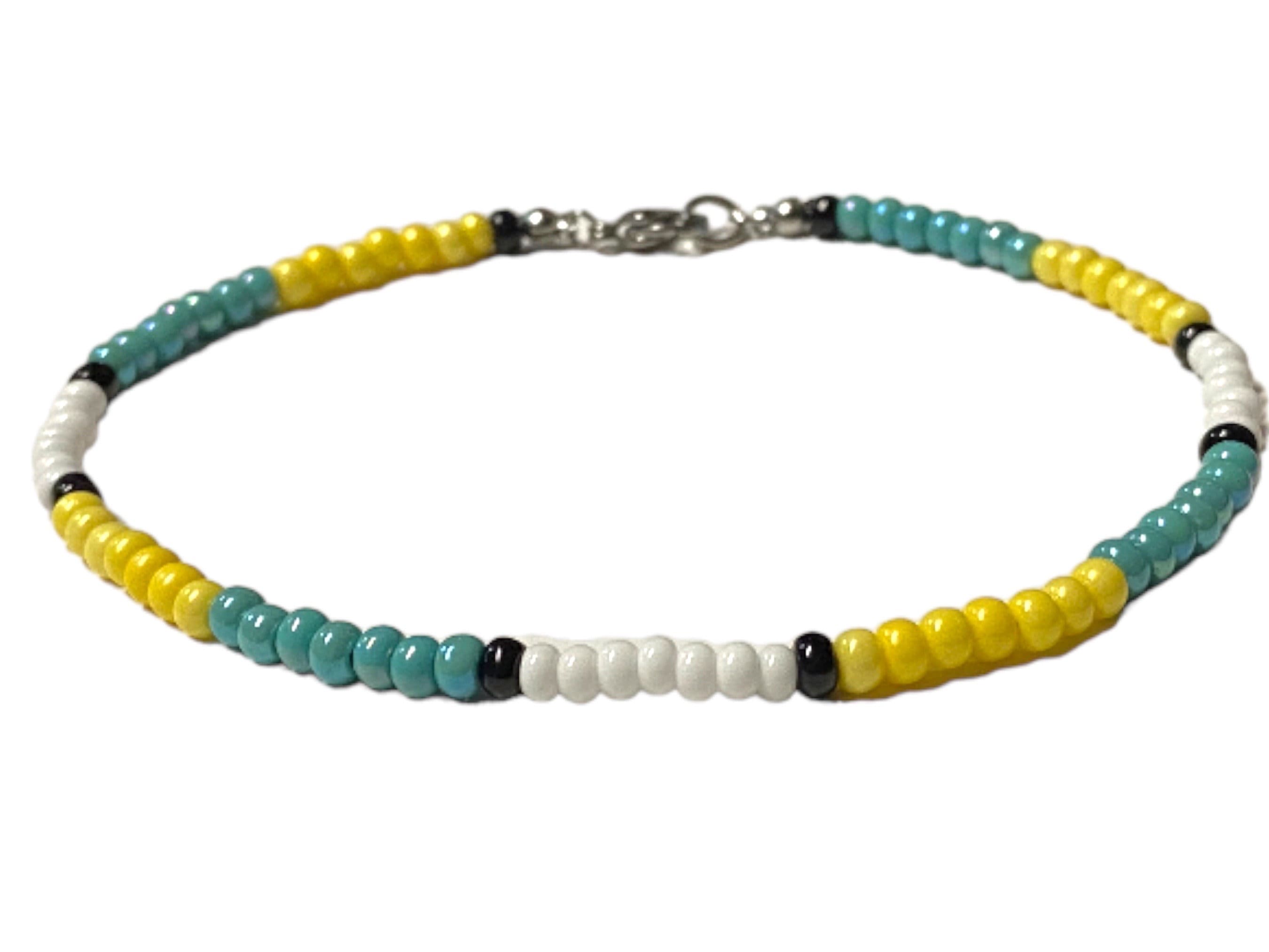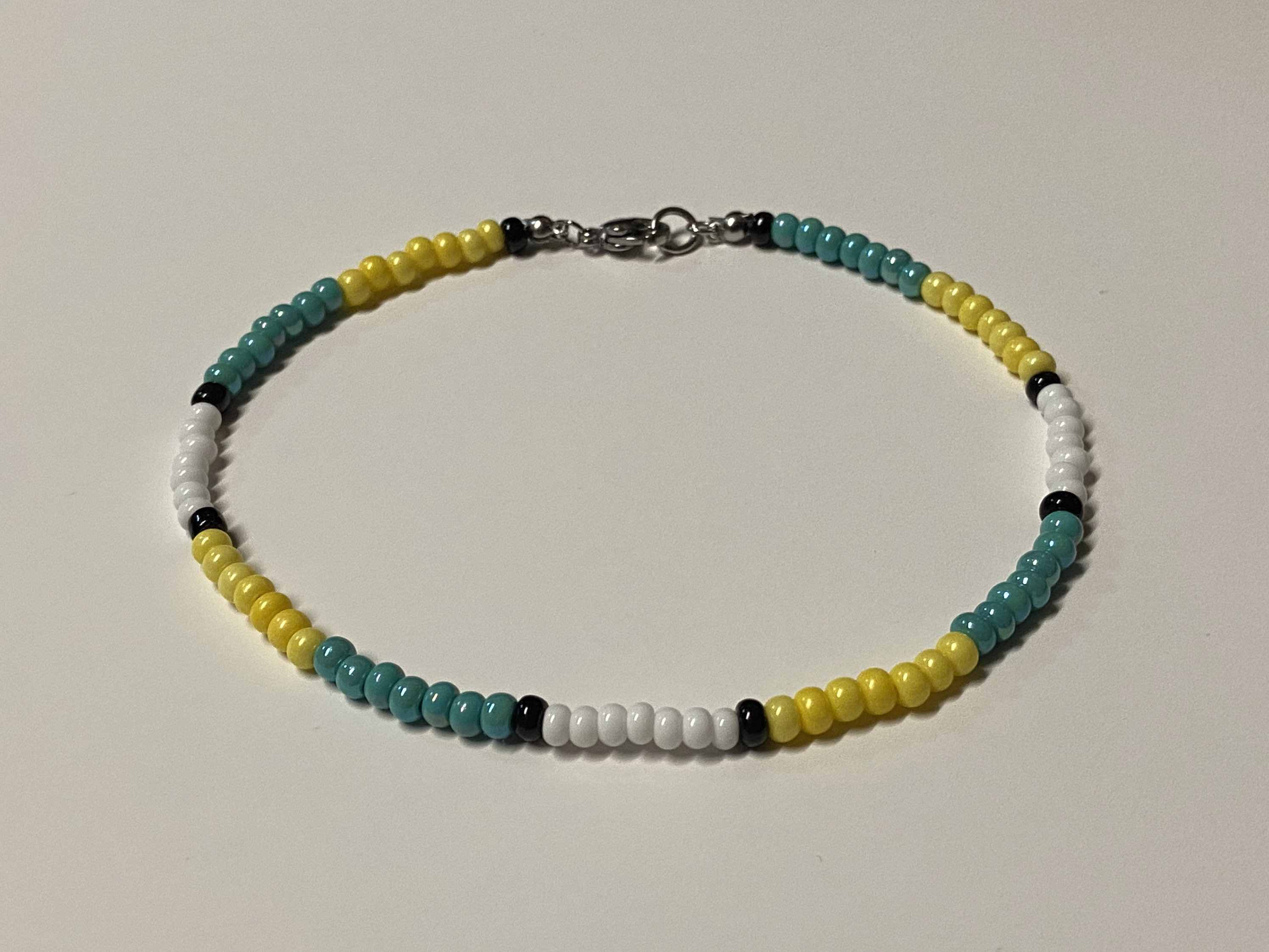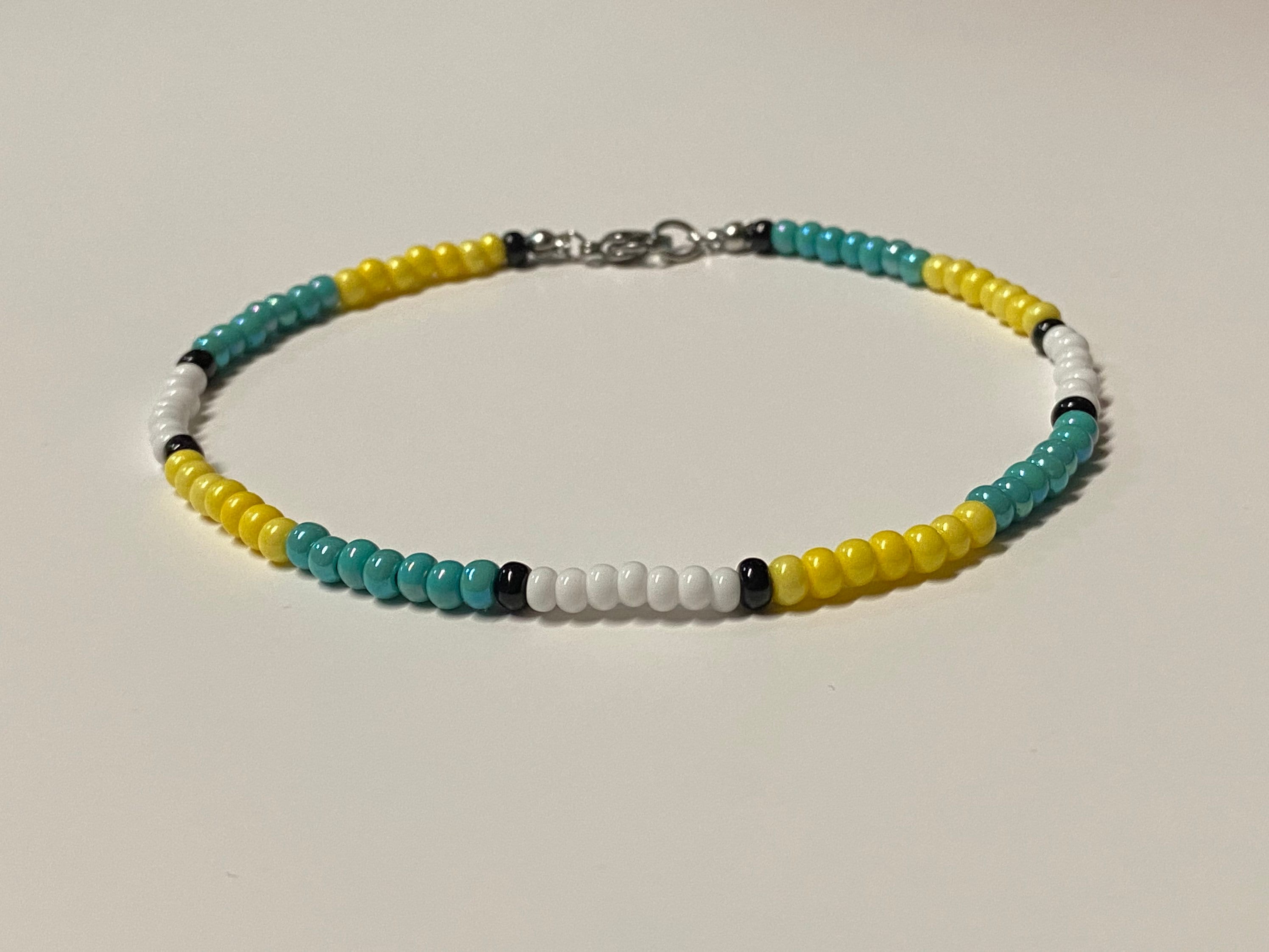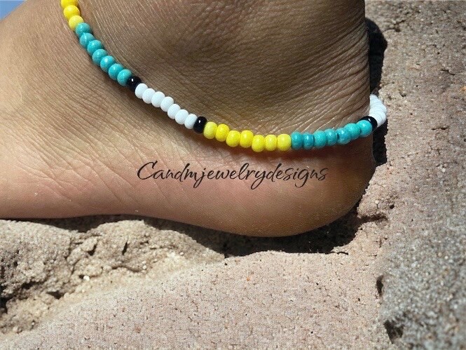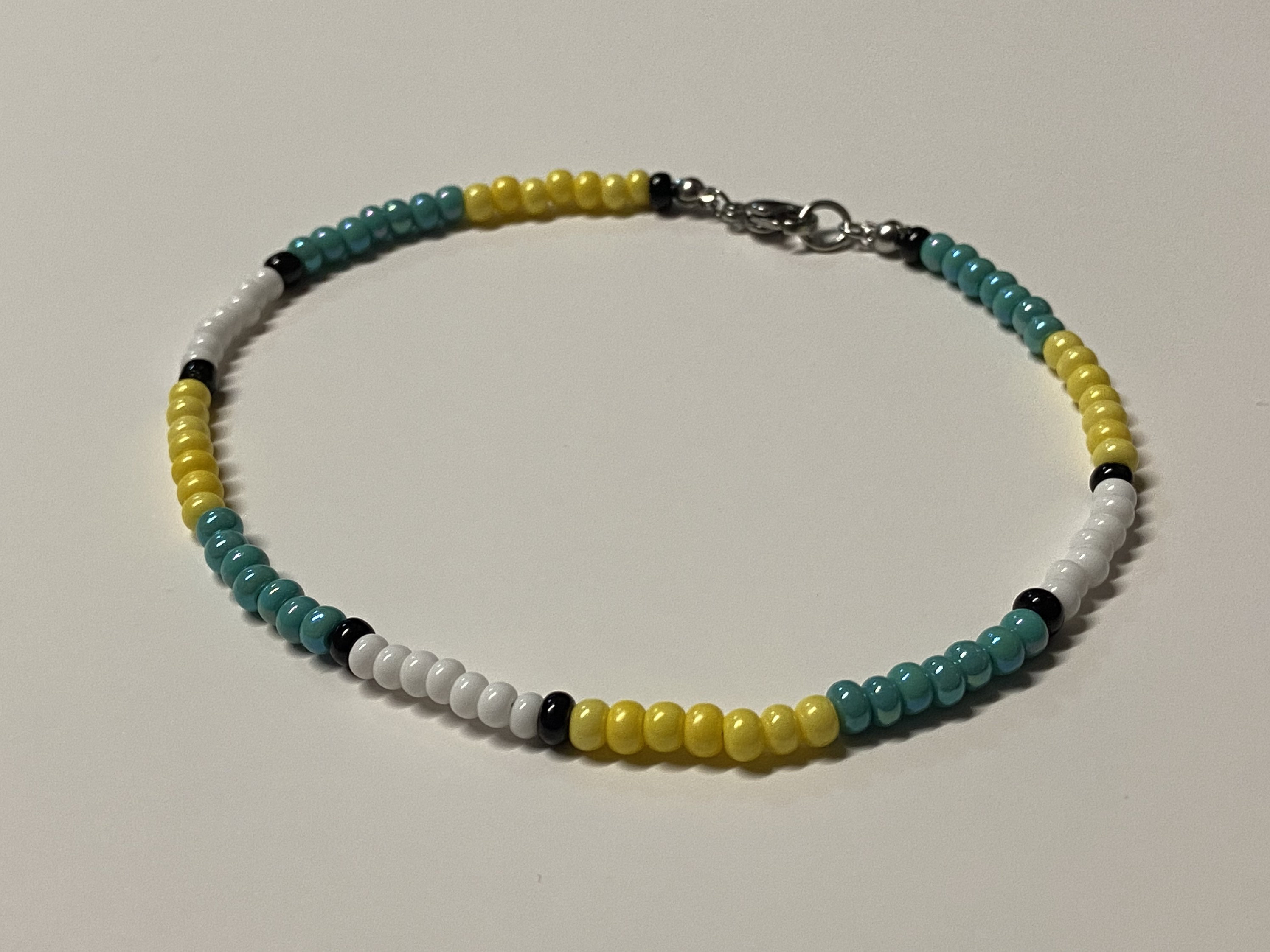 I use white, yellow, black and turquoise Czech glass seed beads to create this beaded anklet.