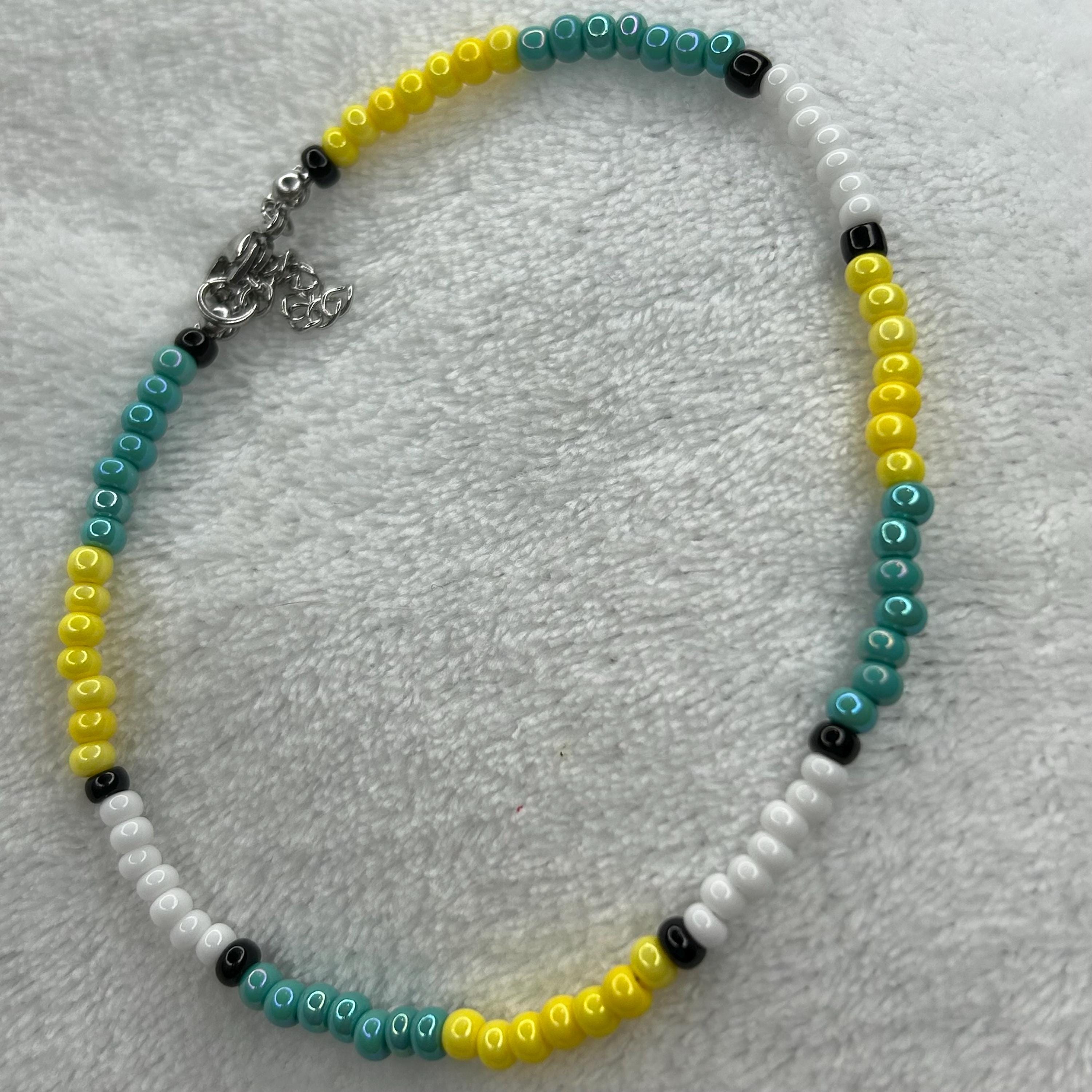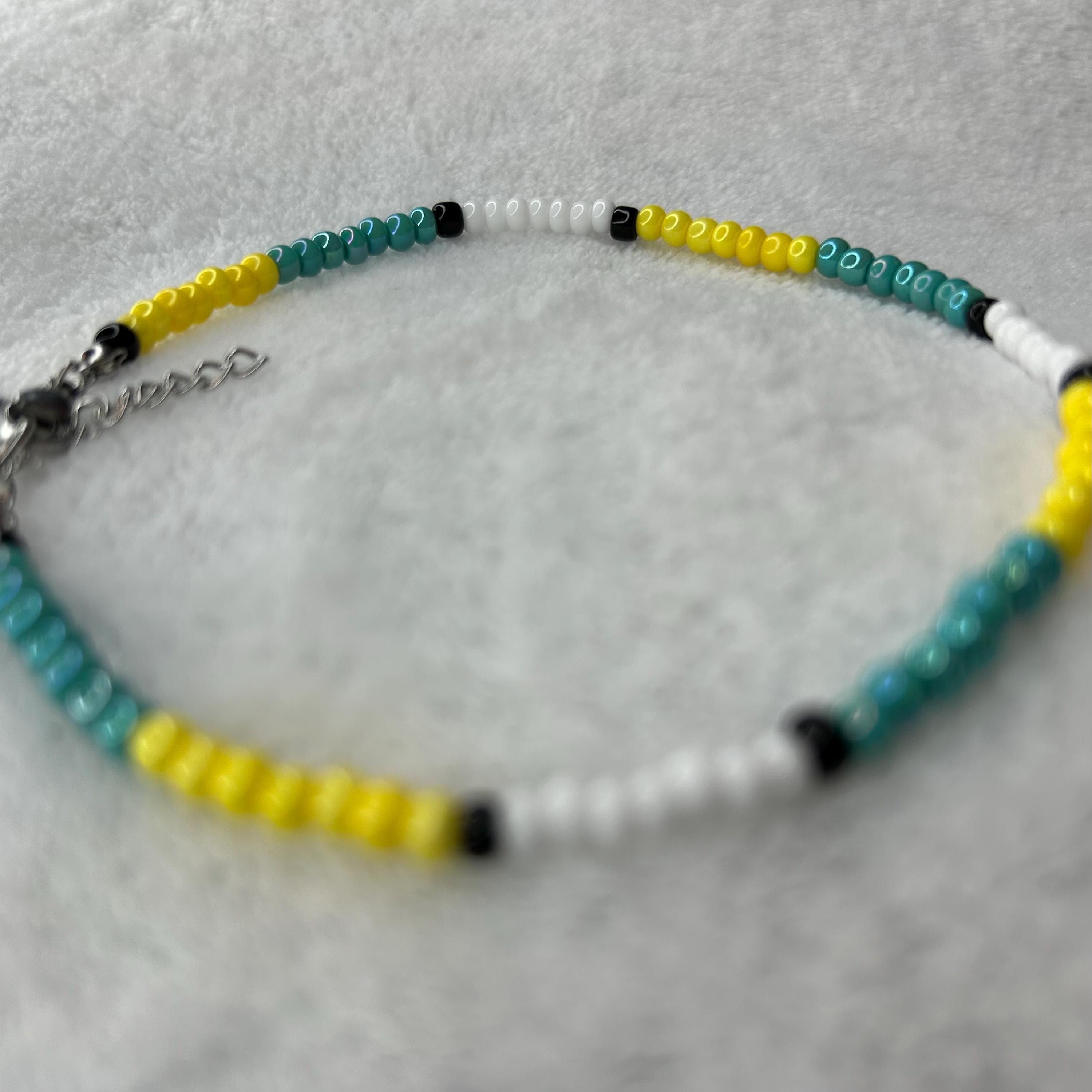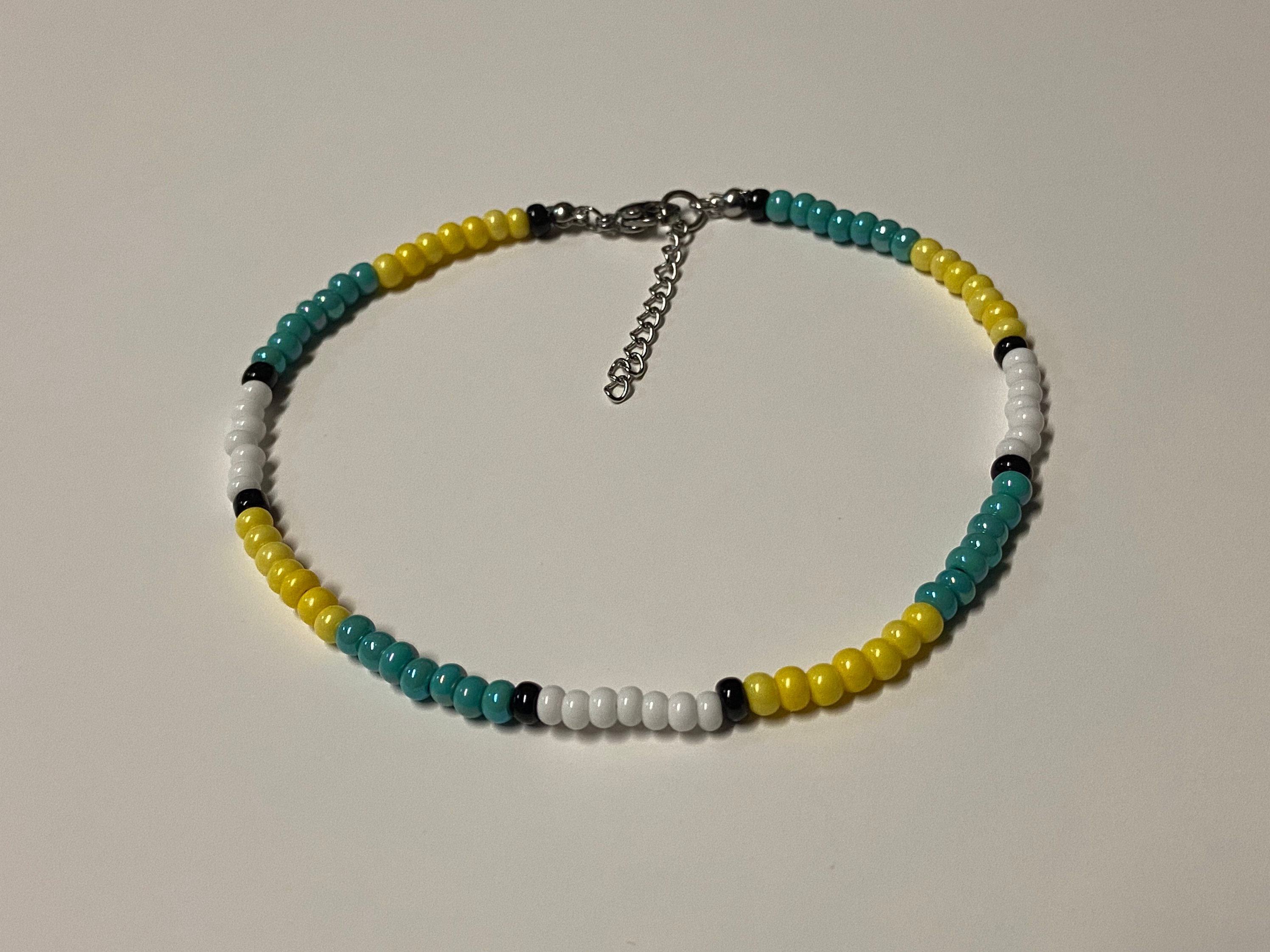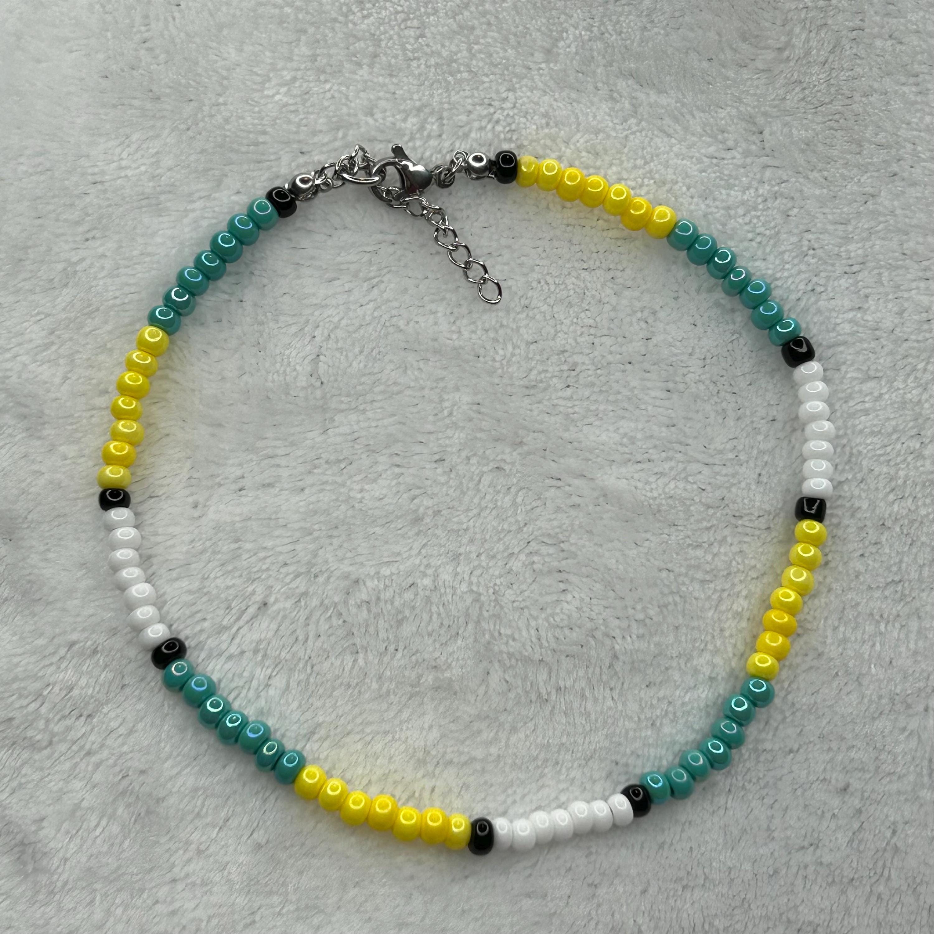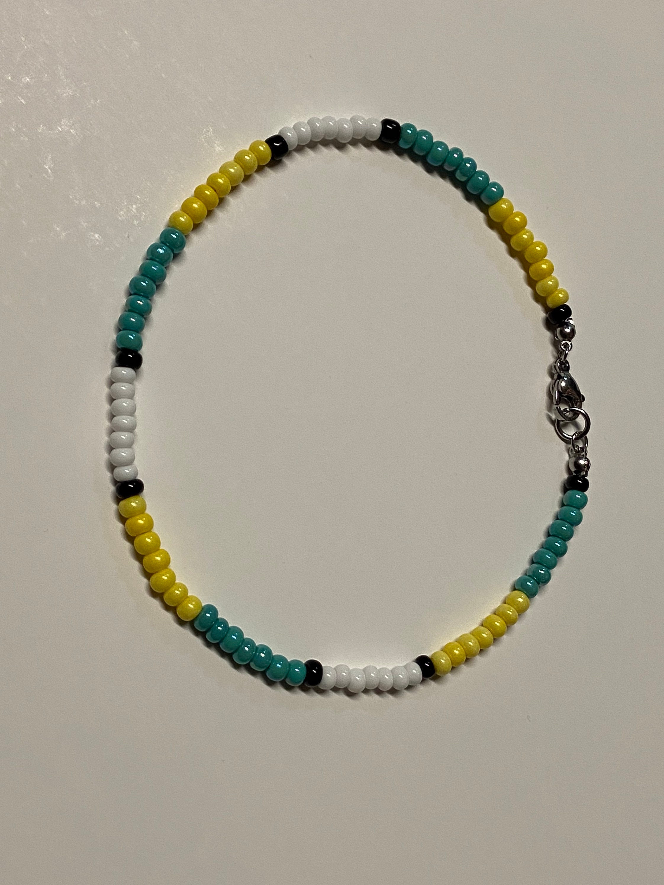 I use white, yellow, black and turquoise Czech glass seed beads to create this beaded anklet.