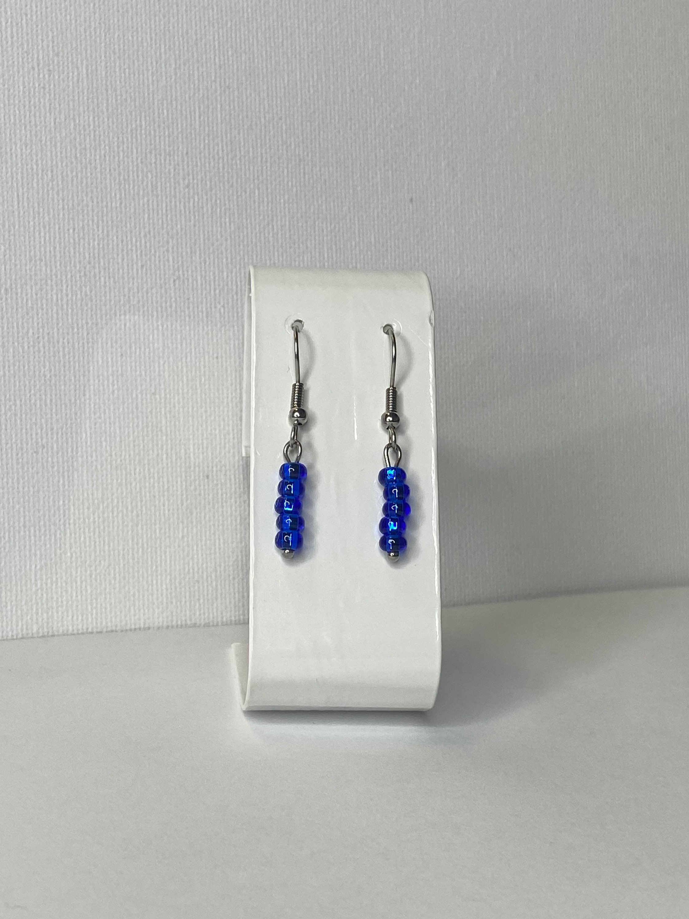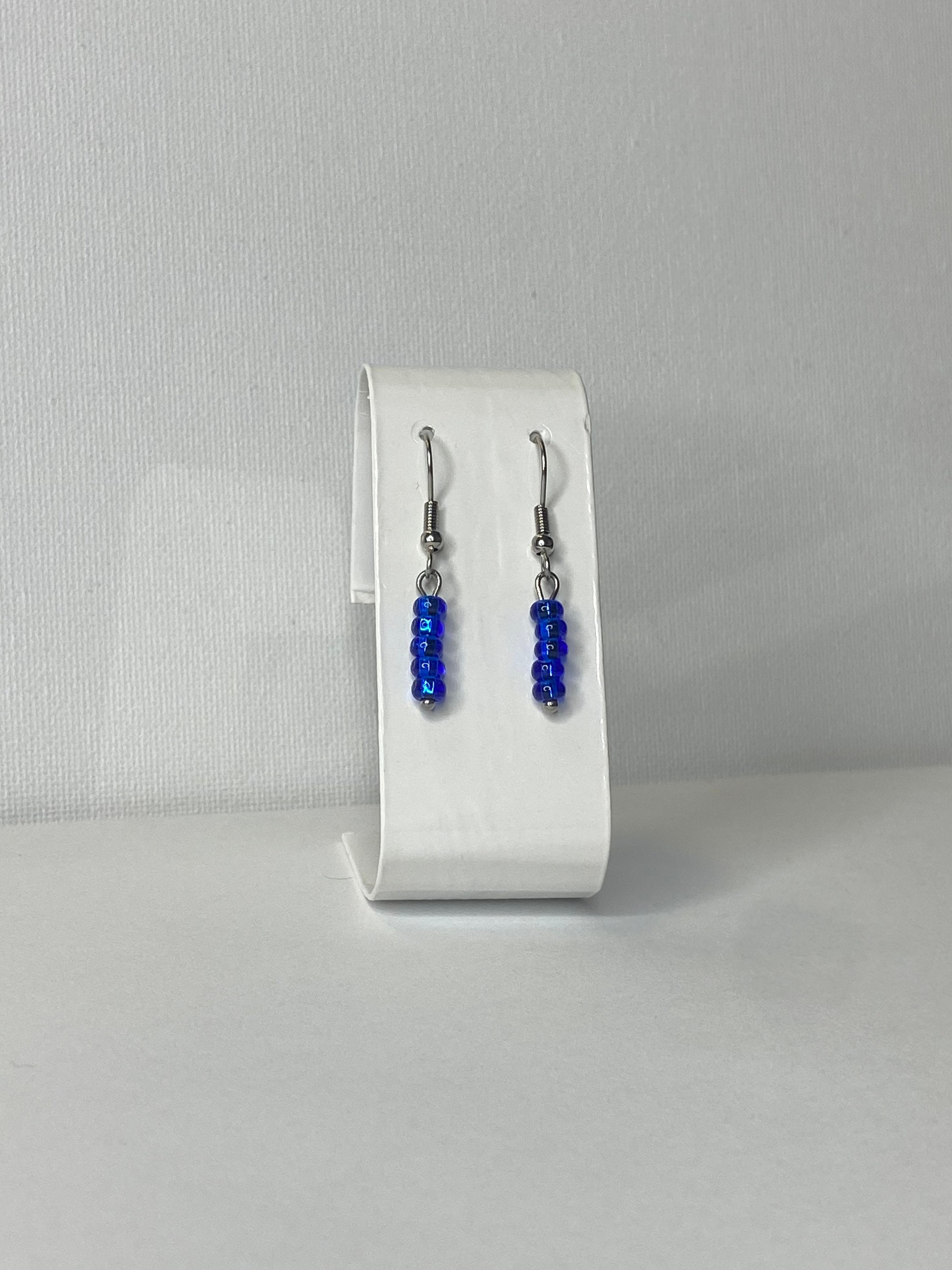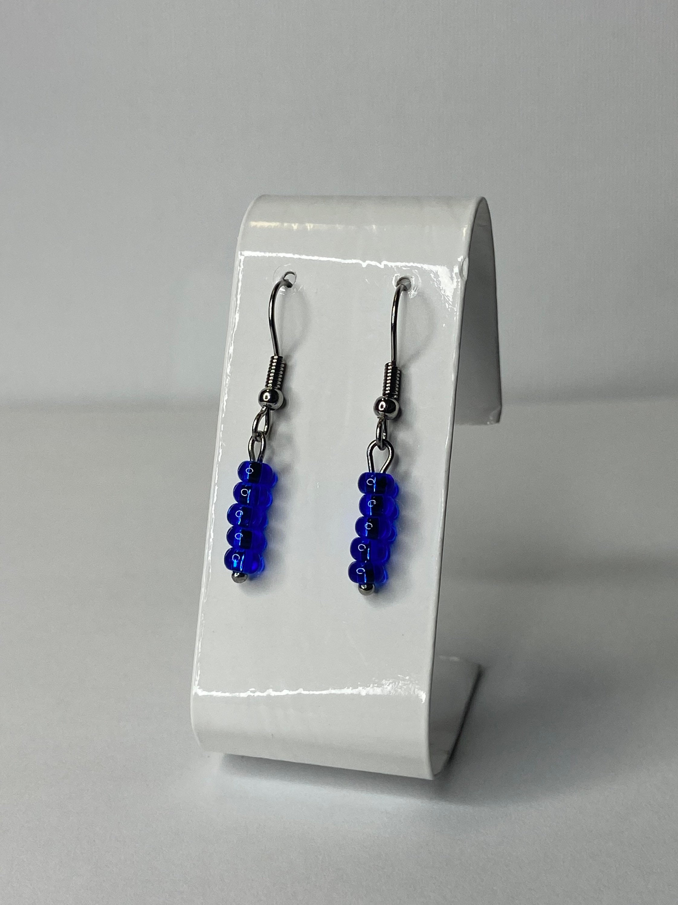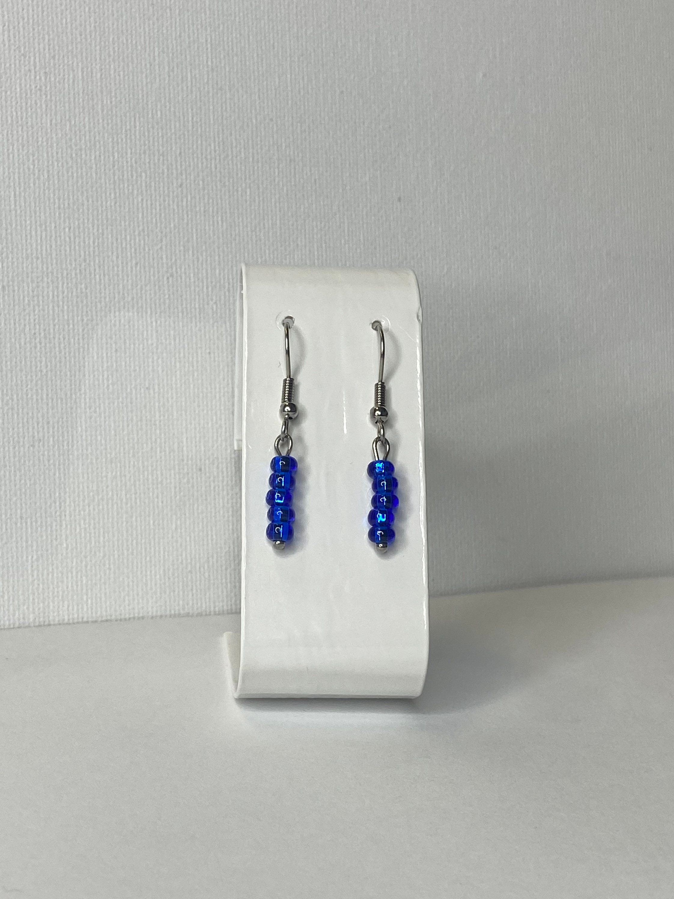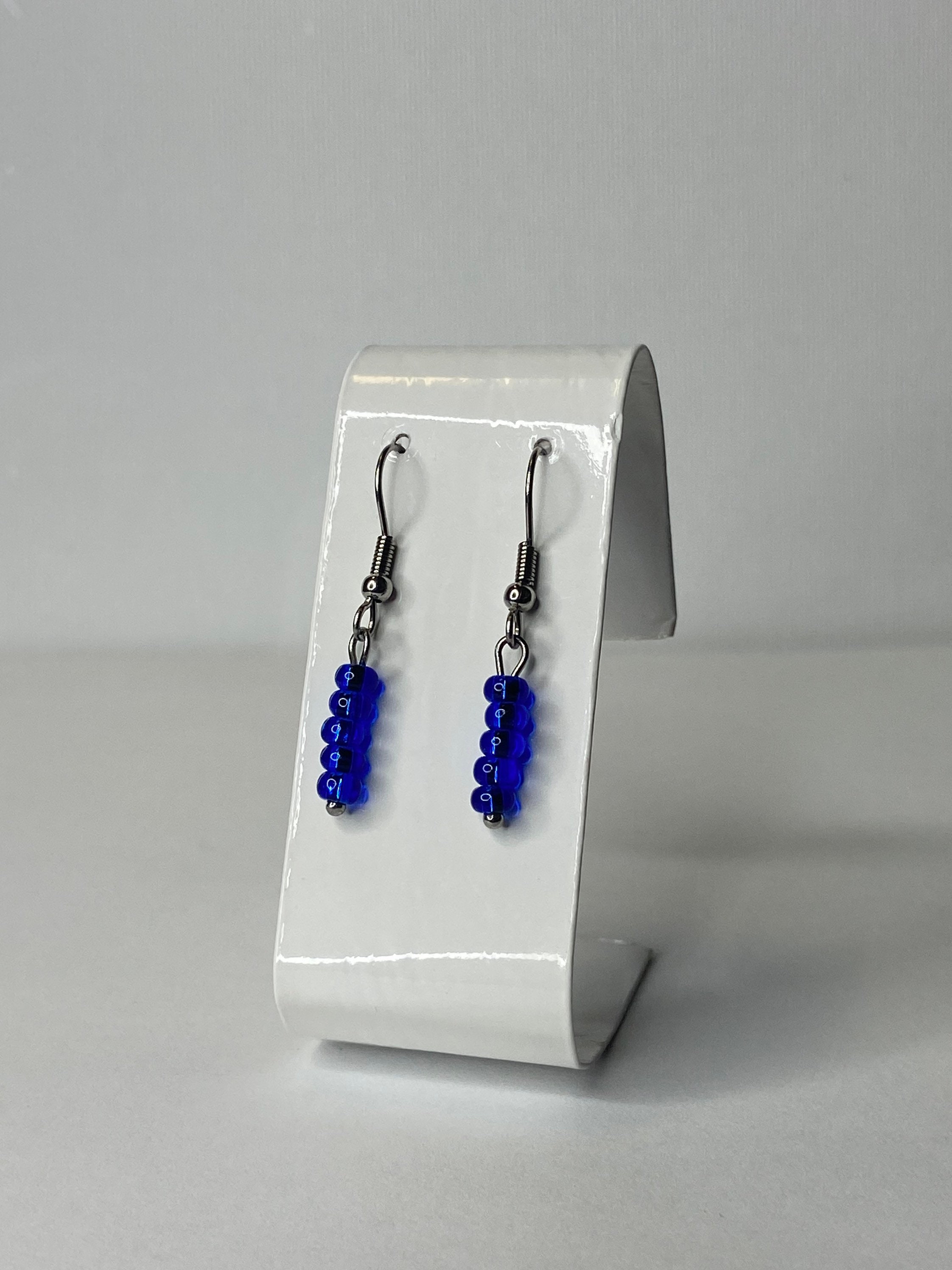 I use Czech sapphire blue seed beads and ear wires to create these stick dangle earrings.