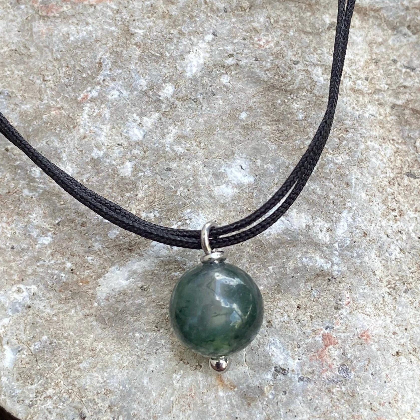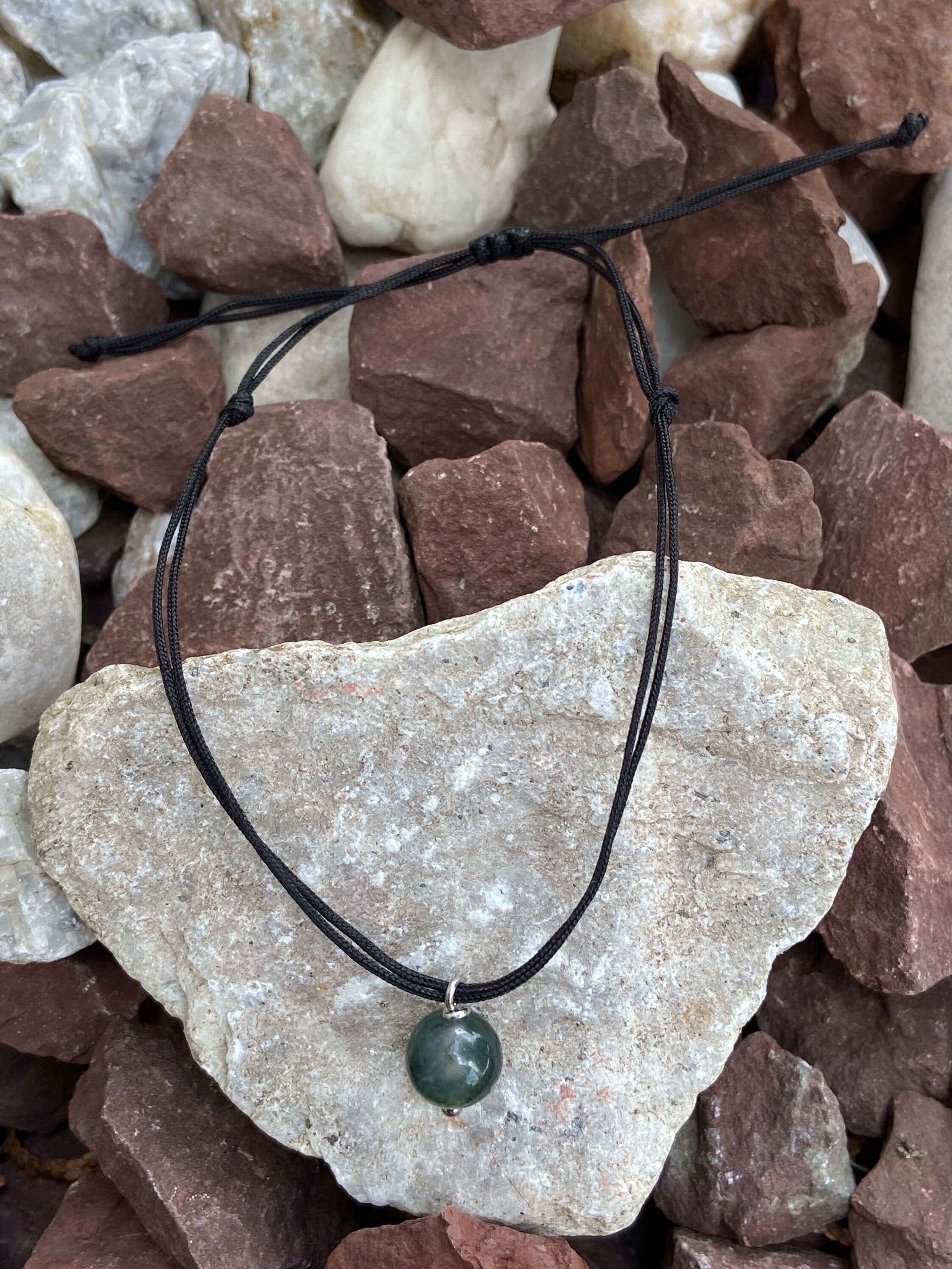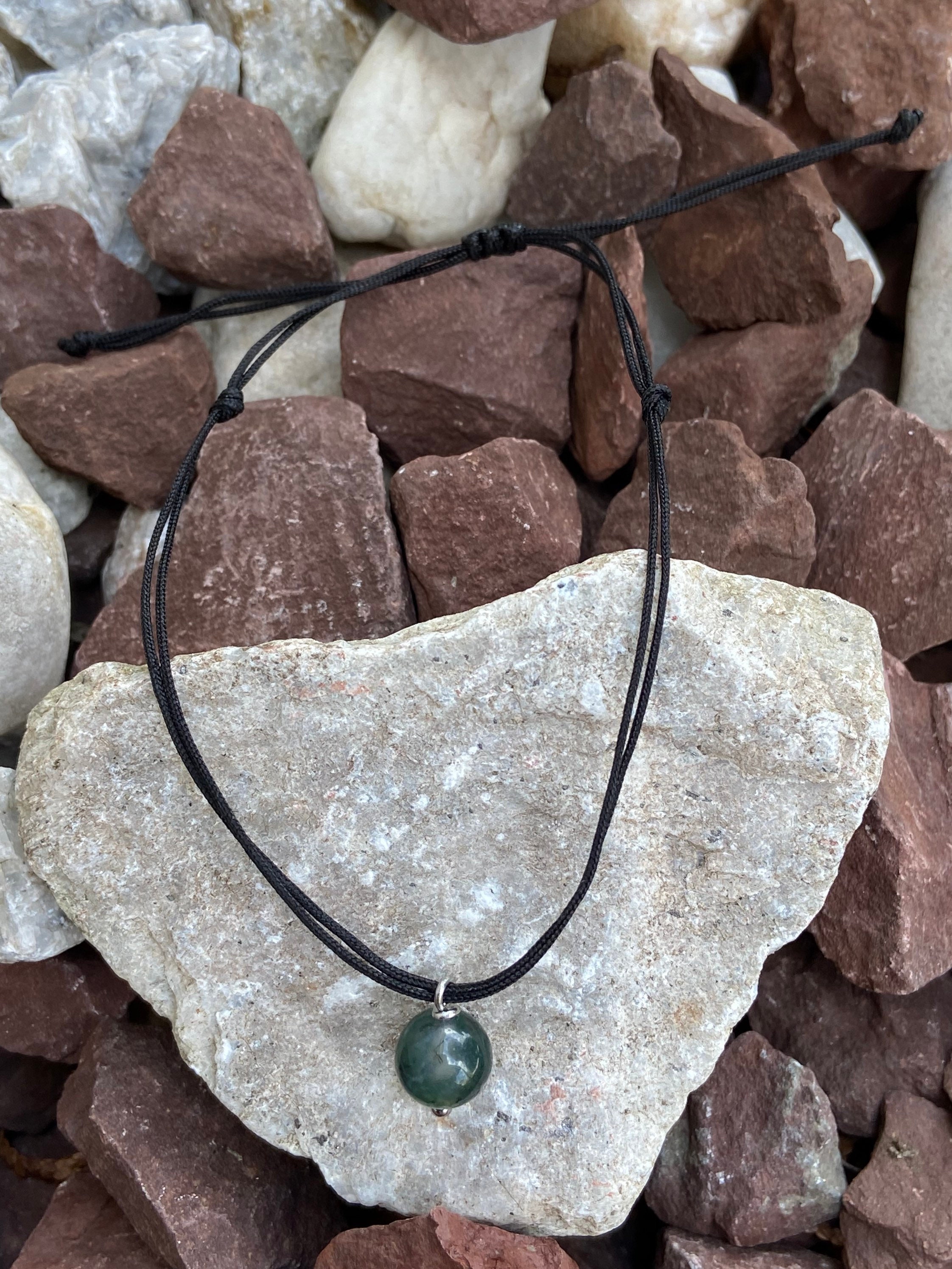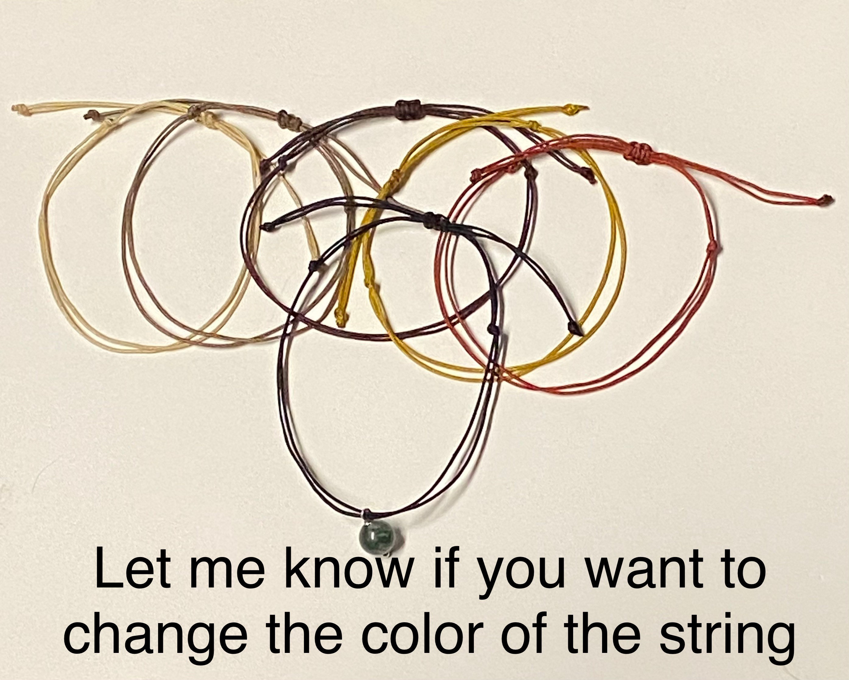 I use black cord and one moss agate bead to create this adjustable bracelet.