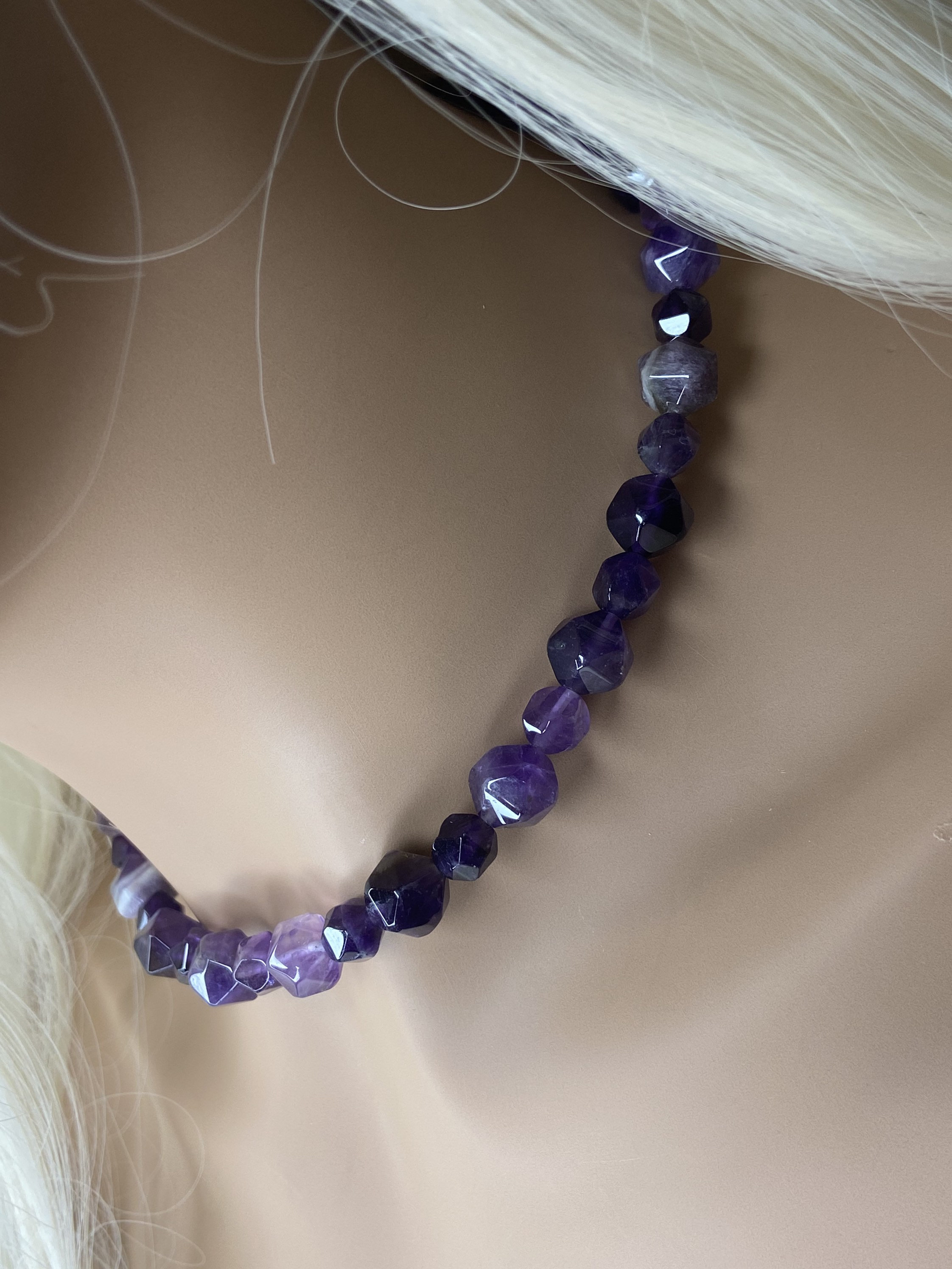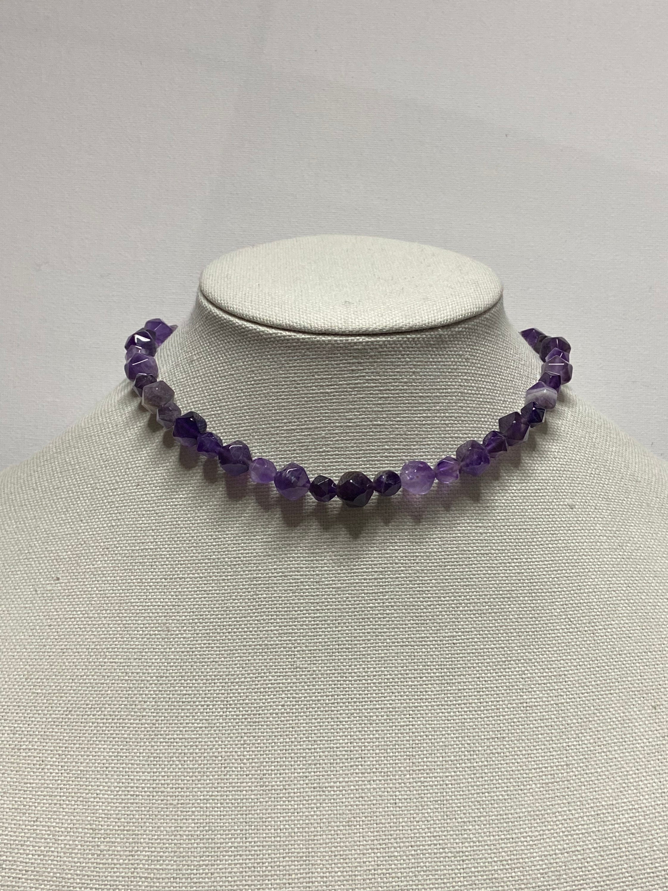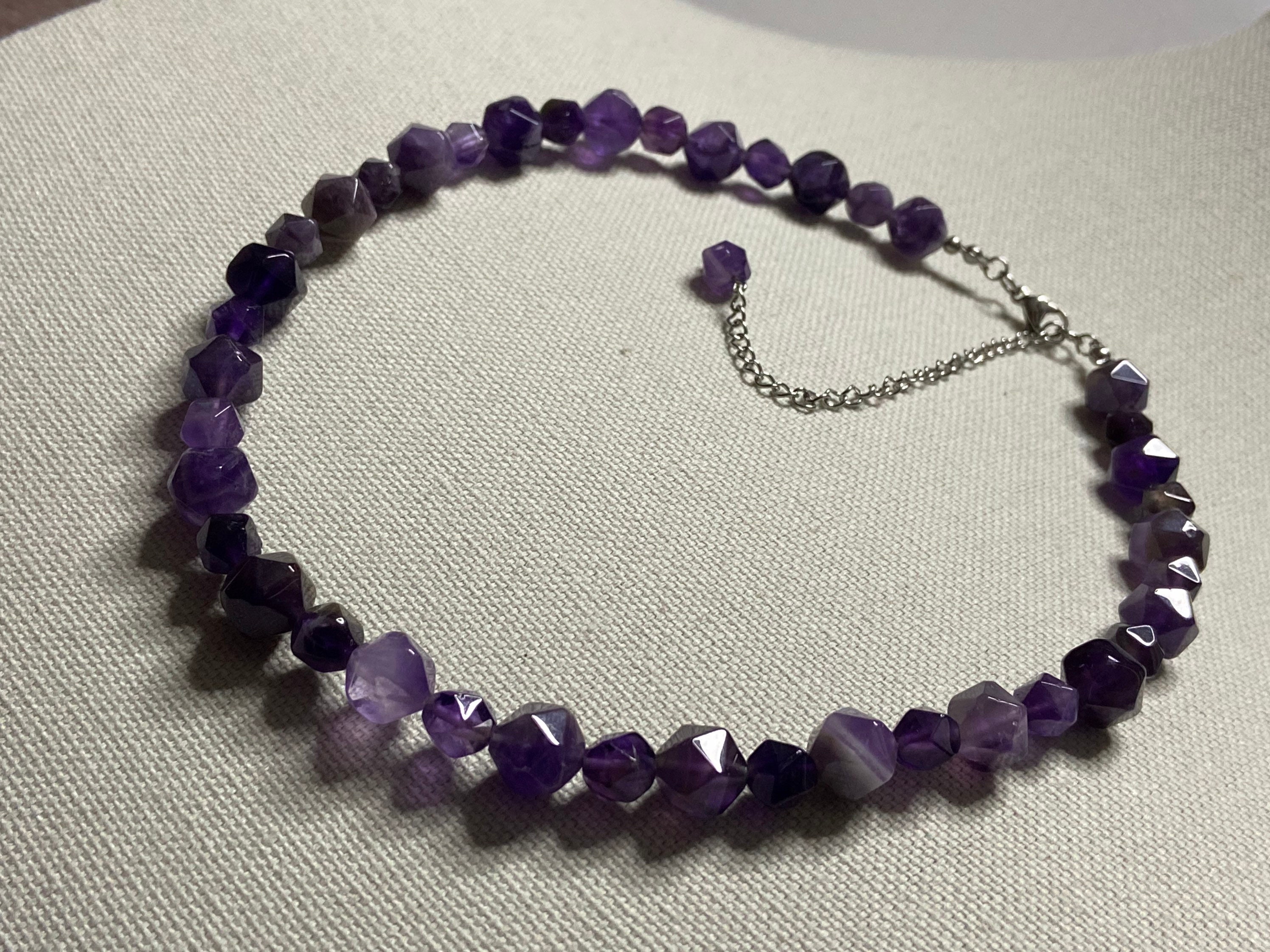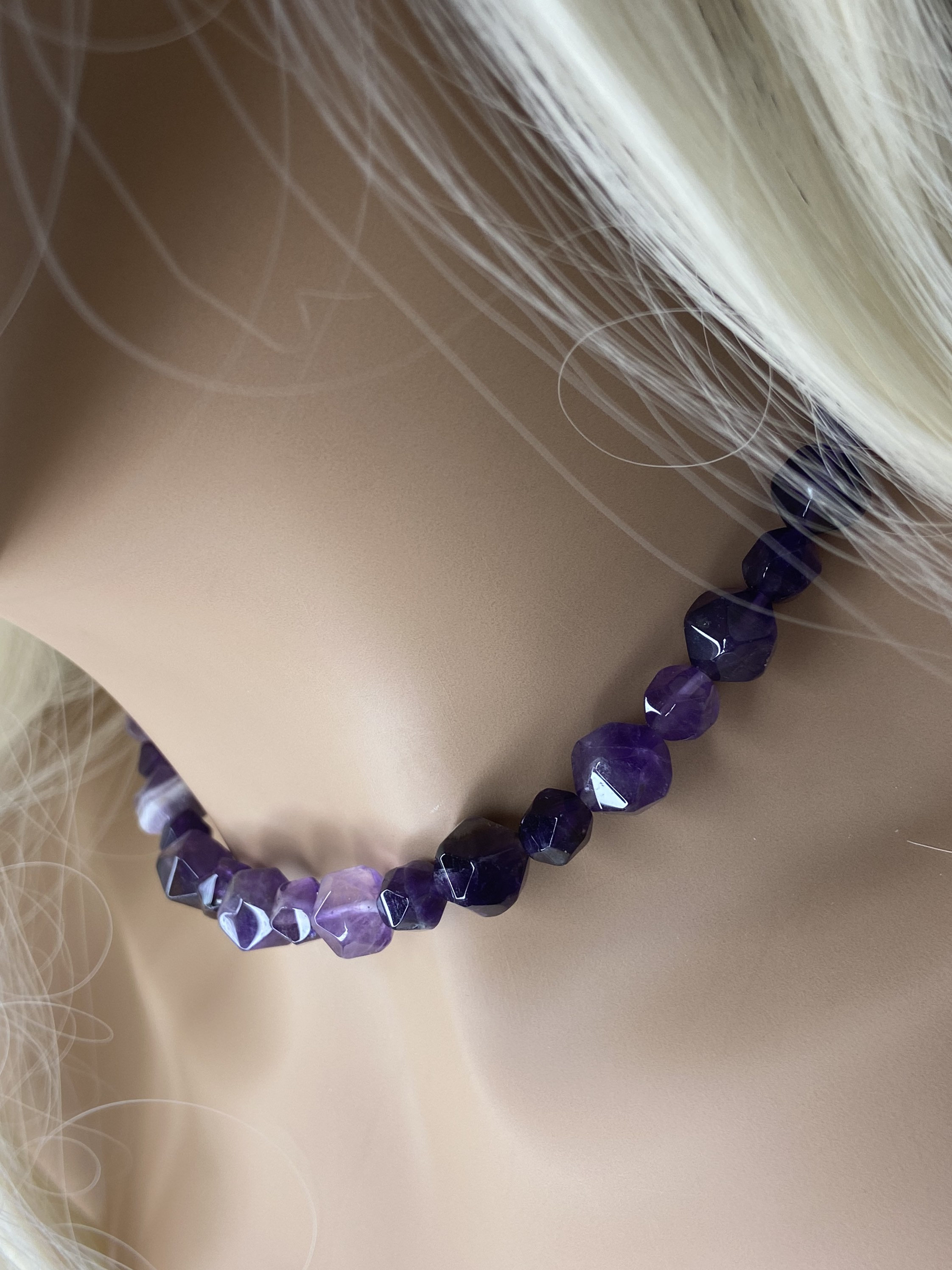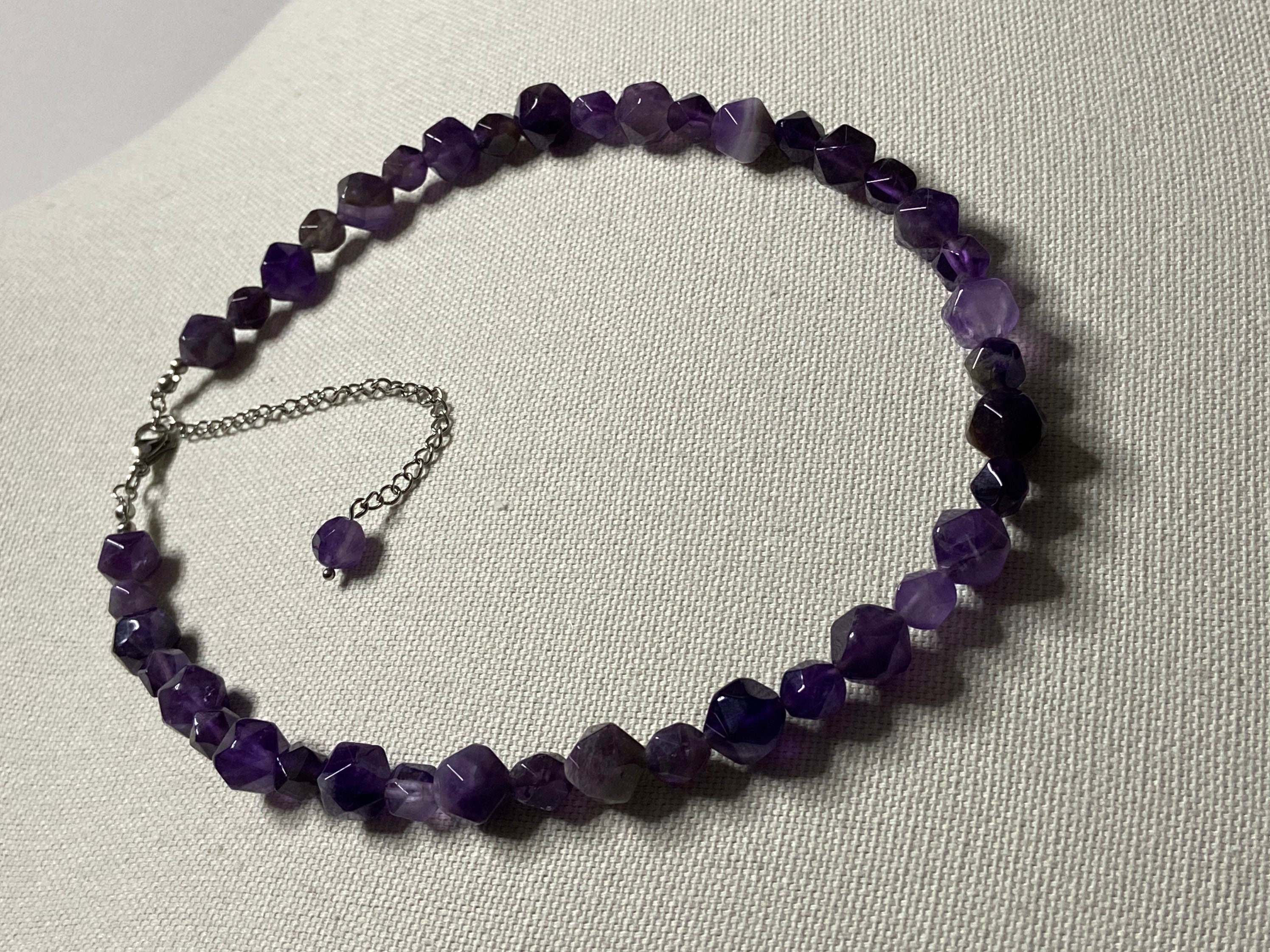 I use 8mm and 10mm star cut amethyst beads to create this adjustable necklace.
