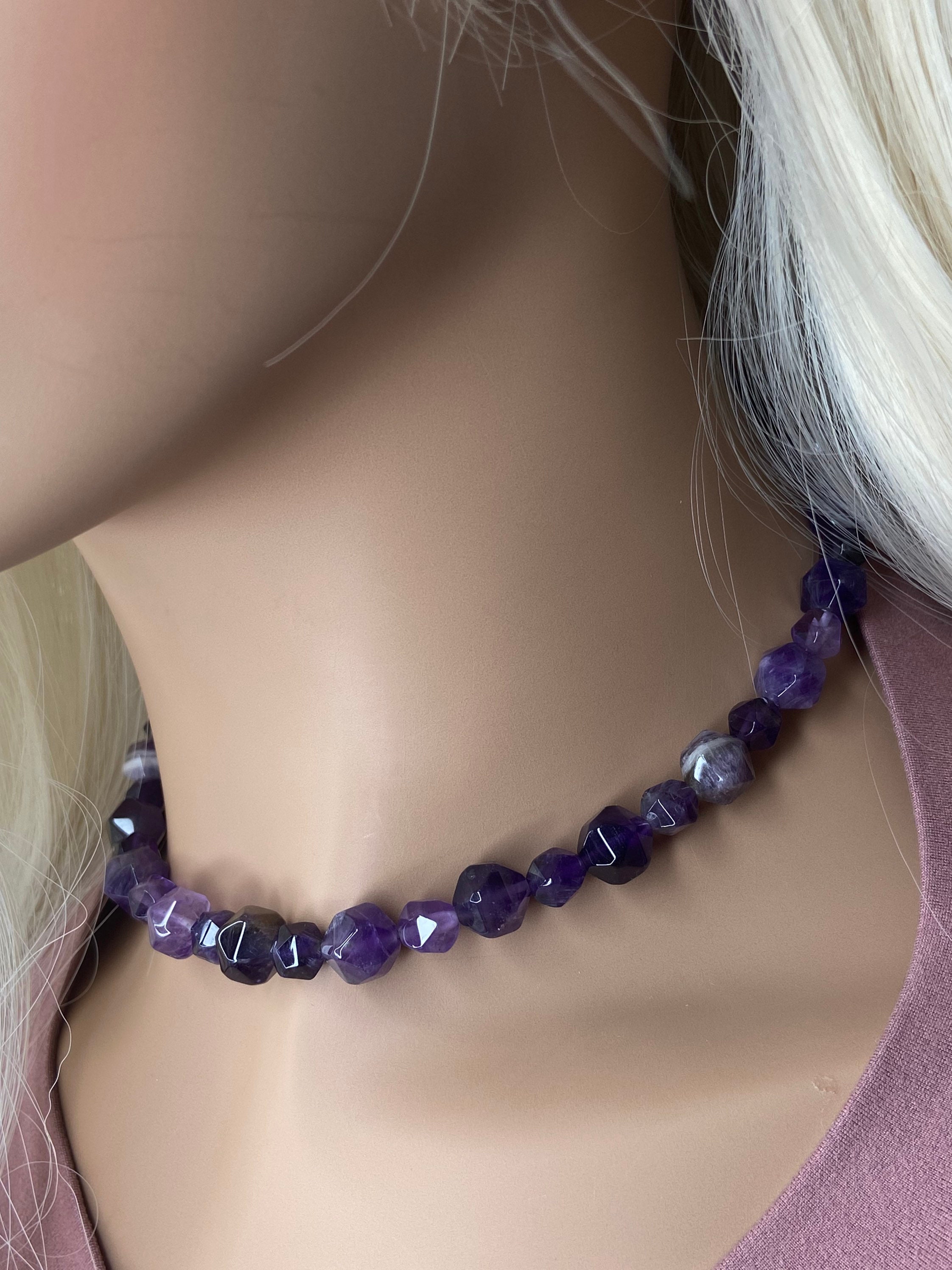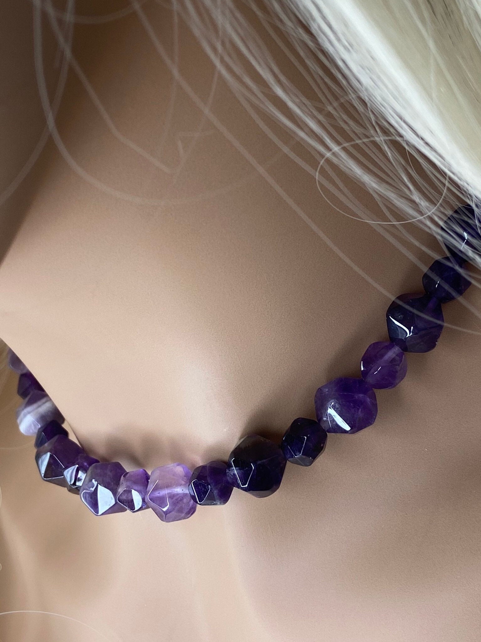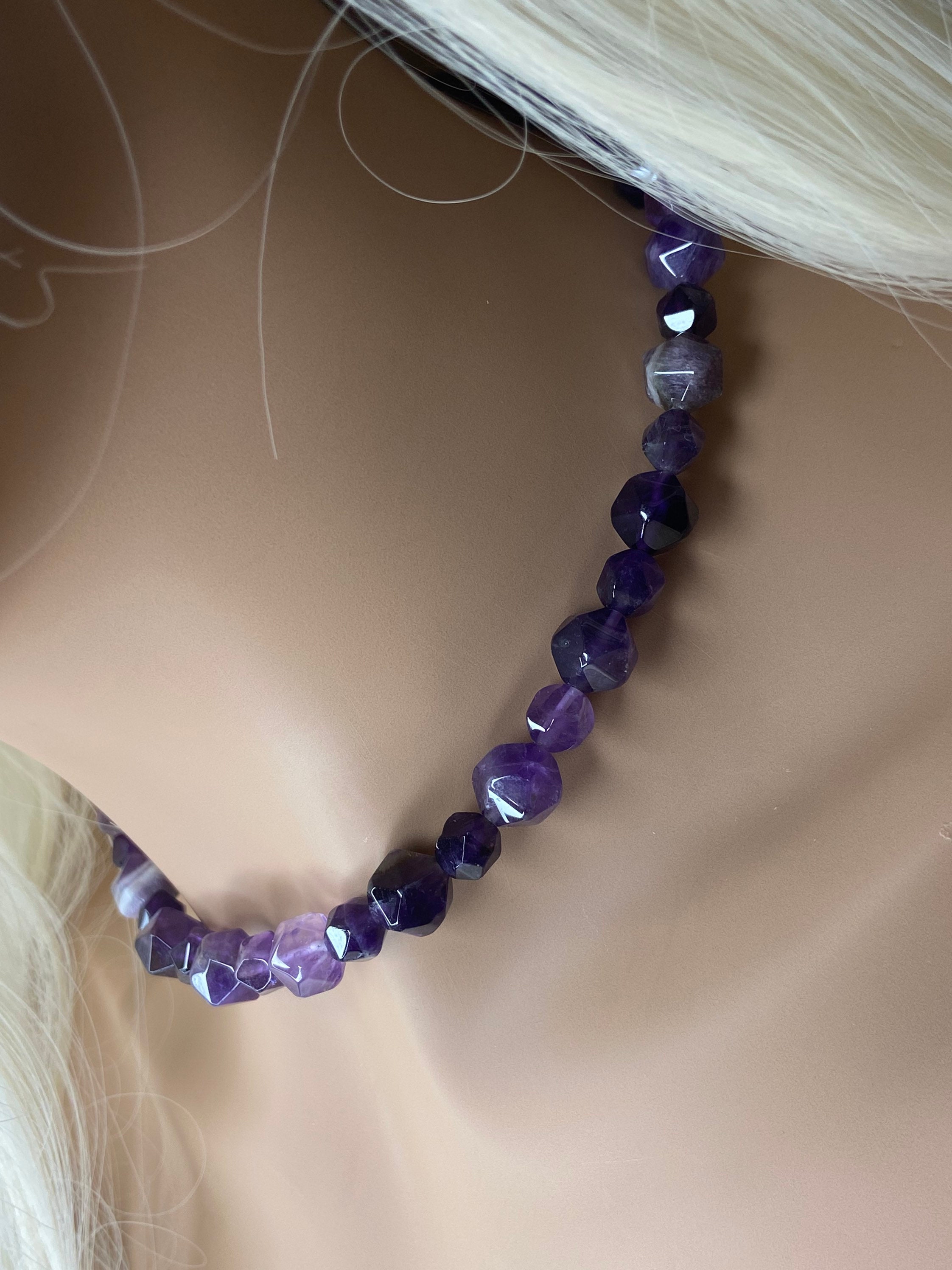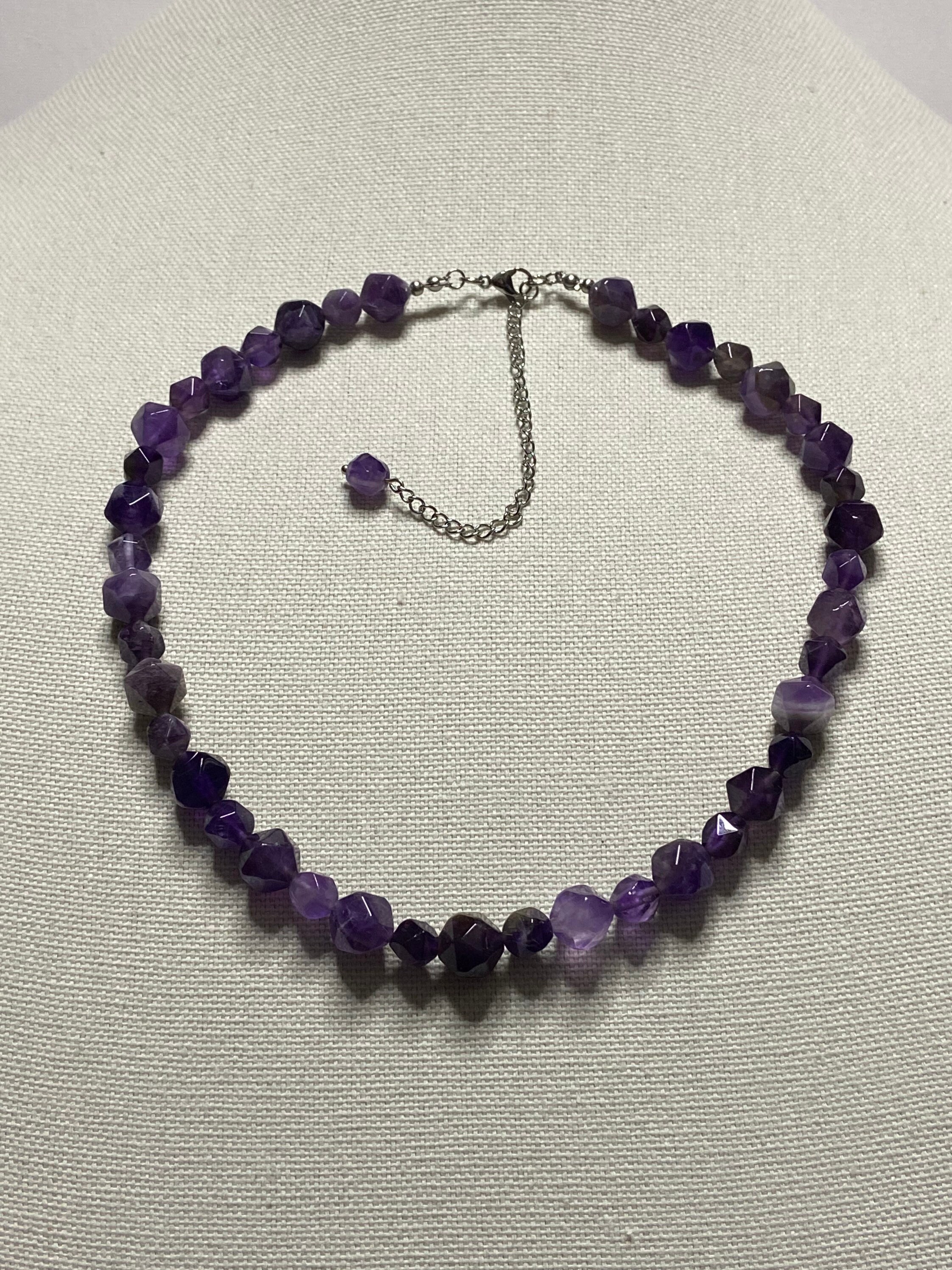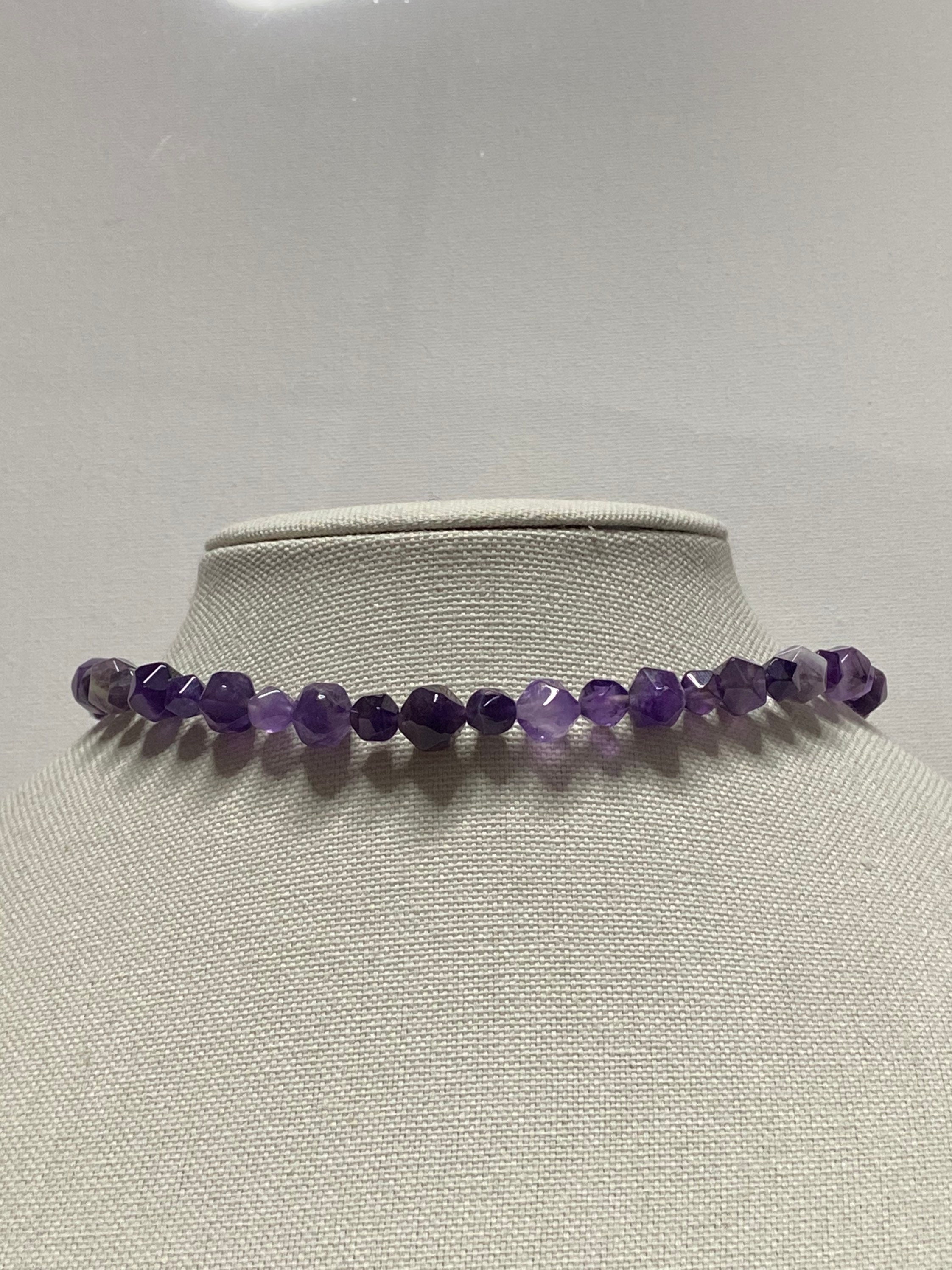I use 8mm and 10mm star cut amethyst beads to create this adjustable necklace.