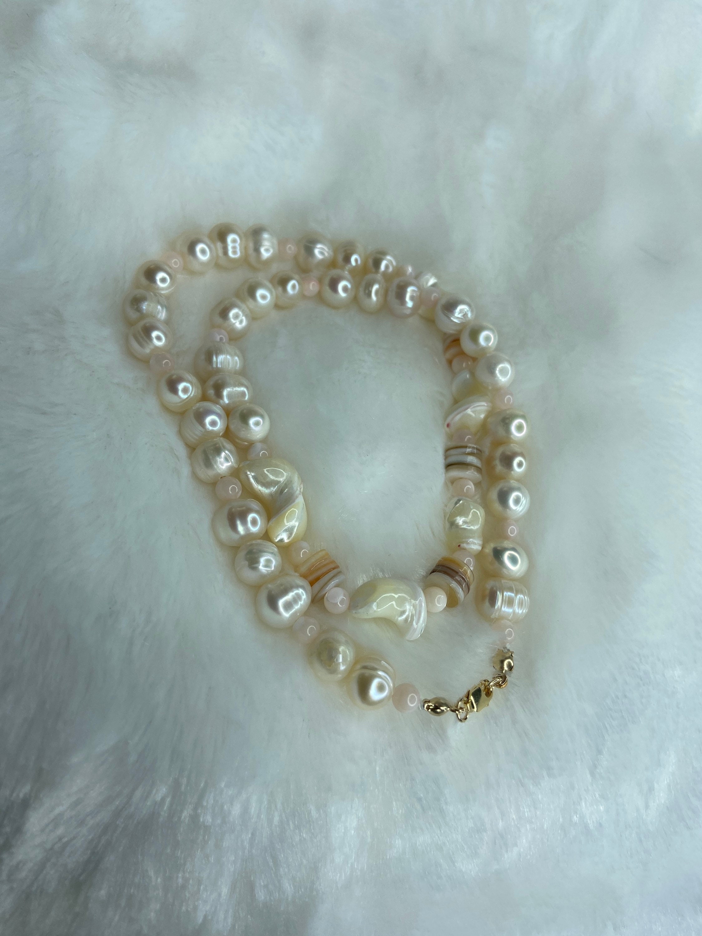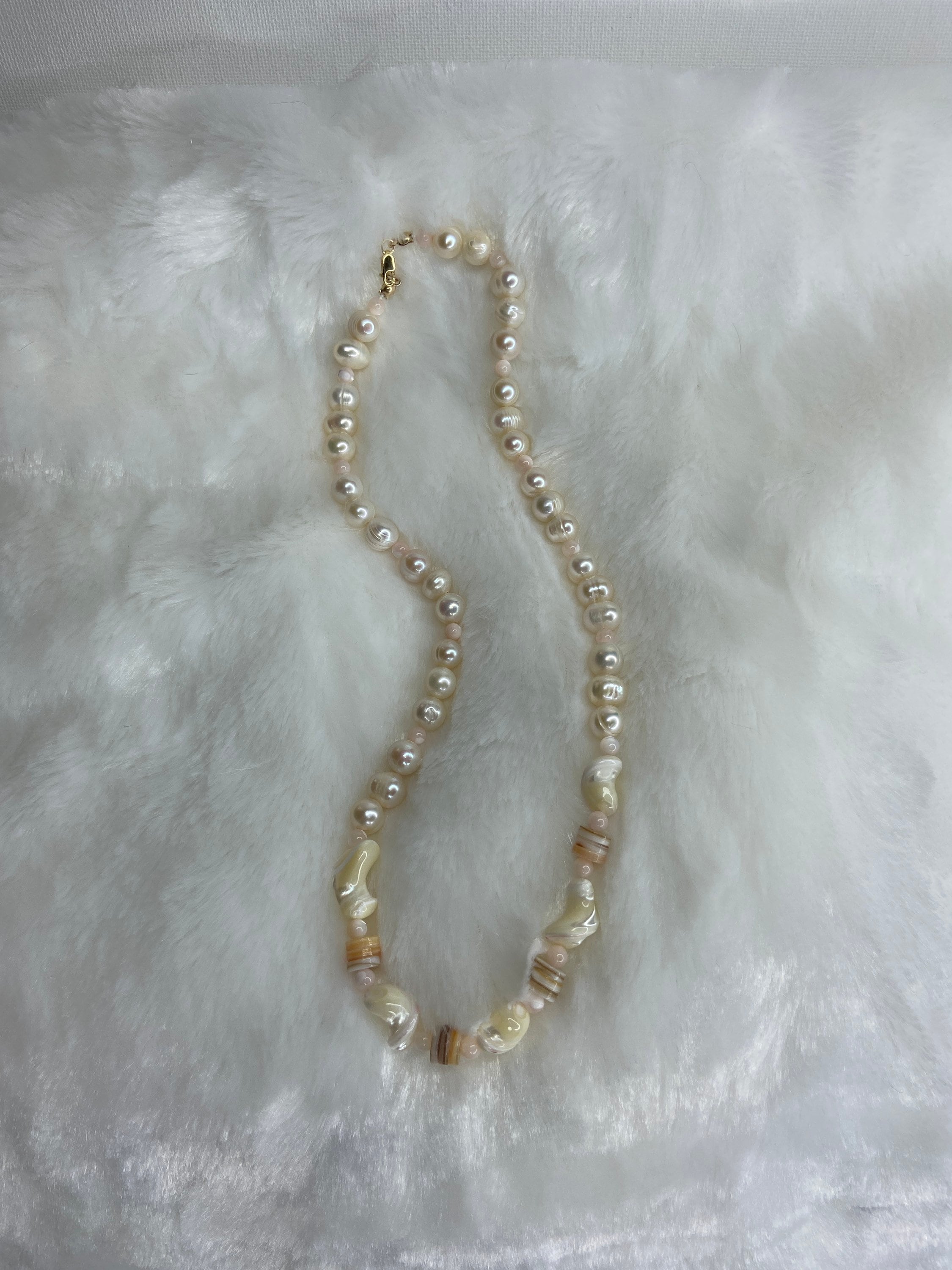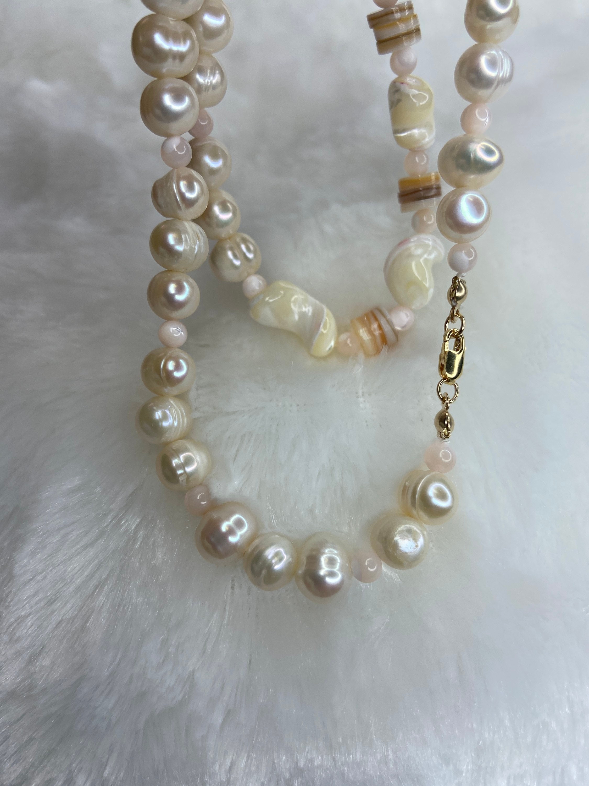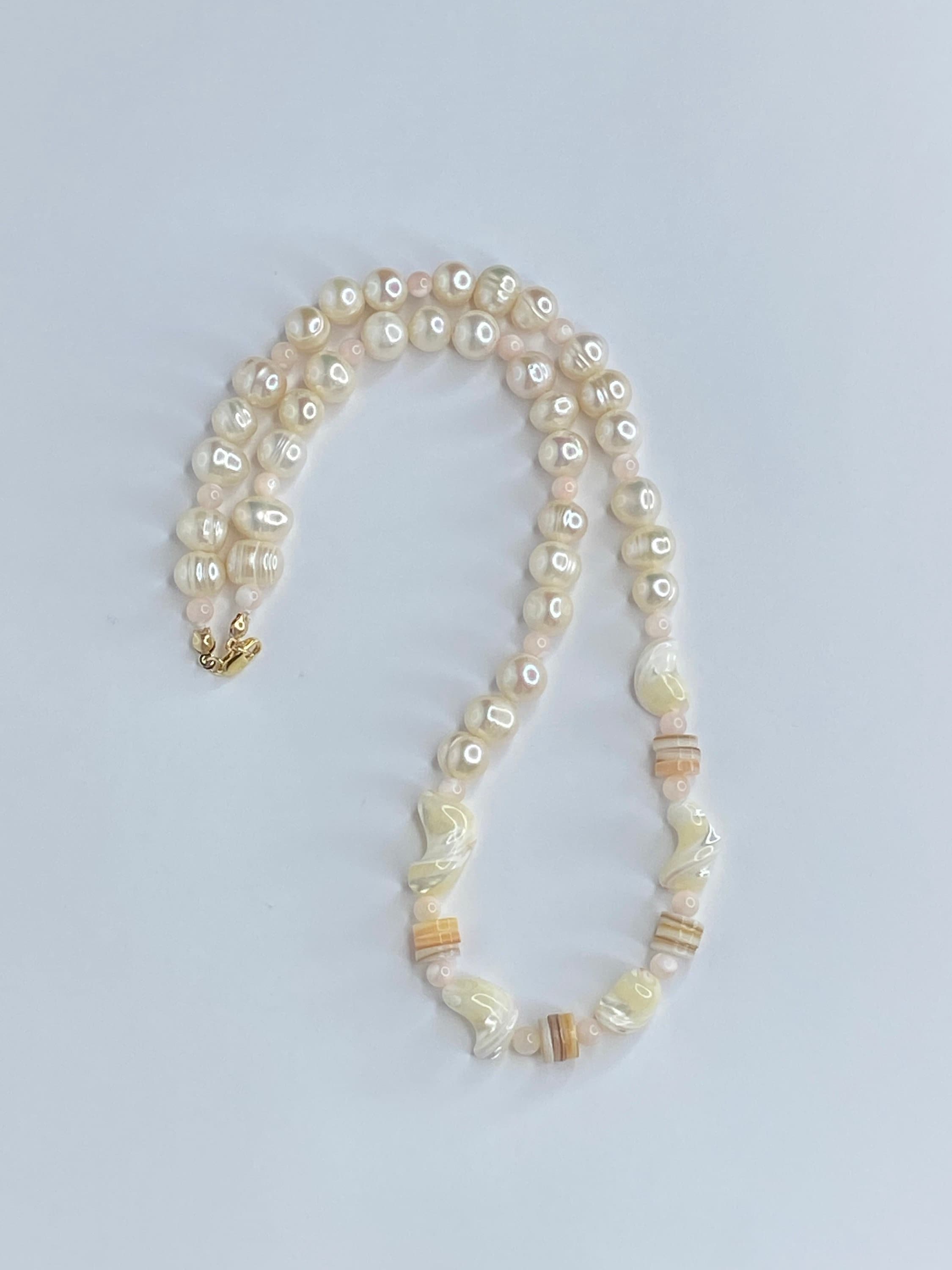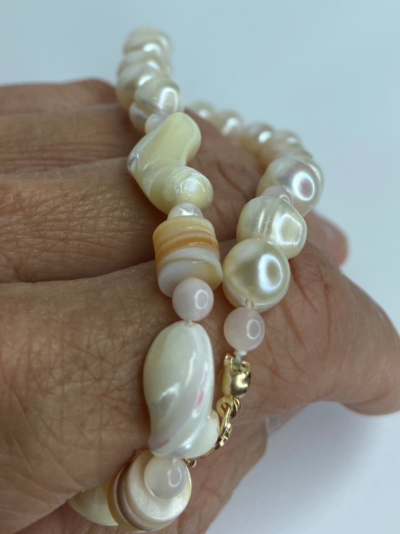 I use 8-9mm freshwater rice pearls along with light pink mother of pearl and shell beads.