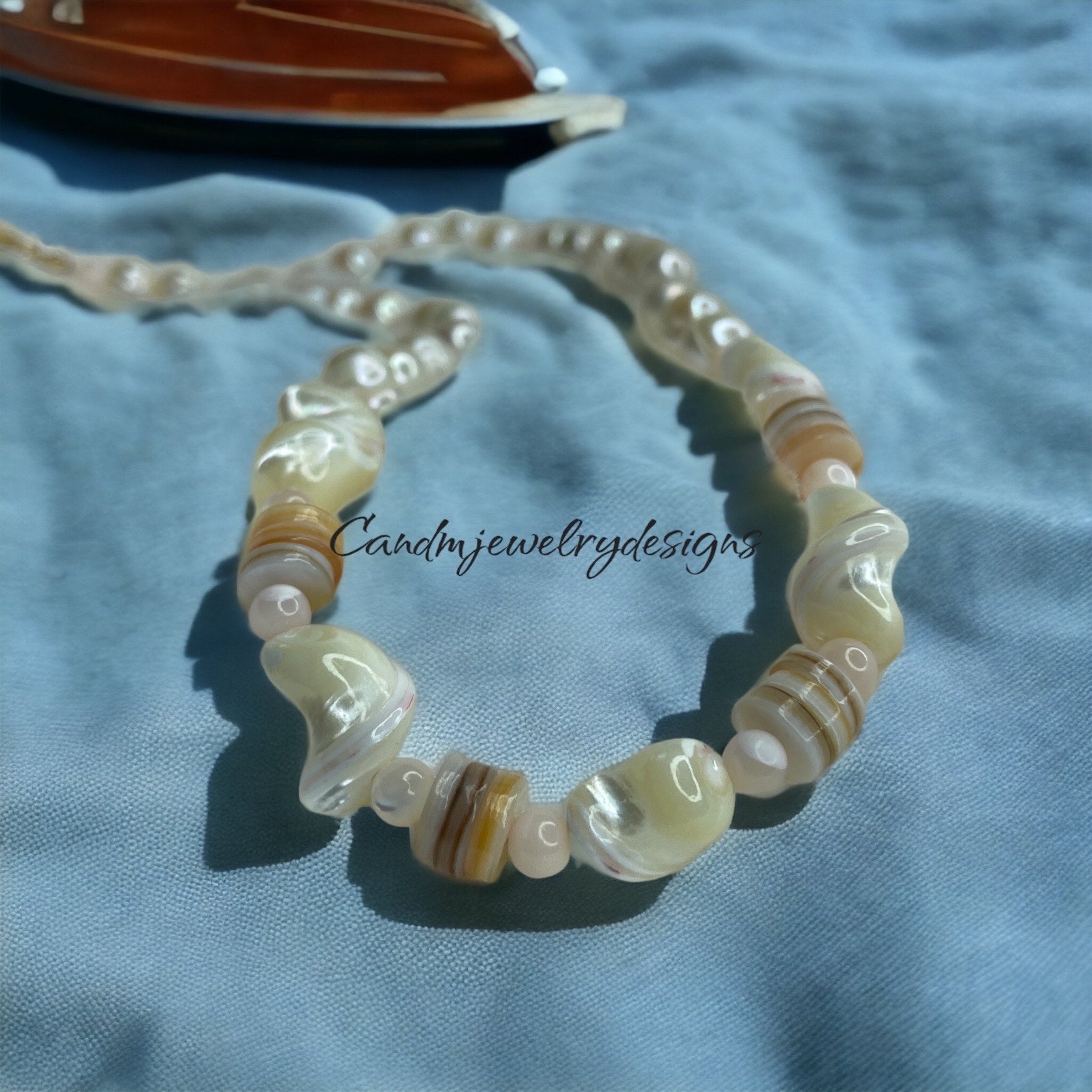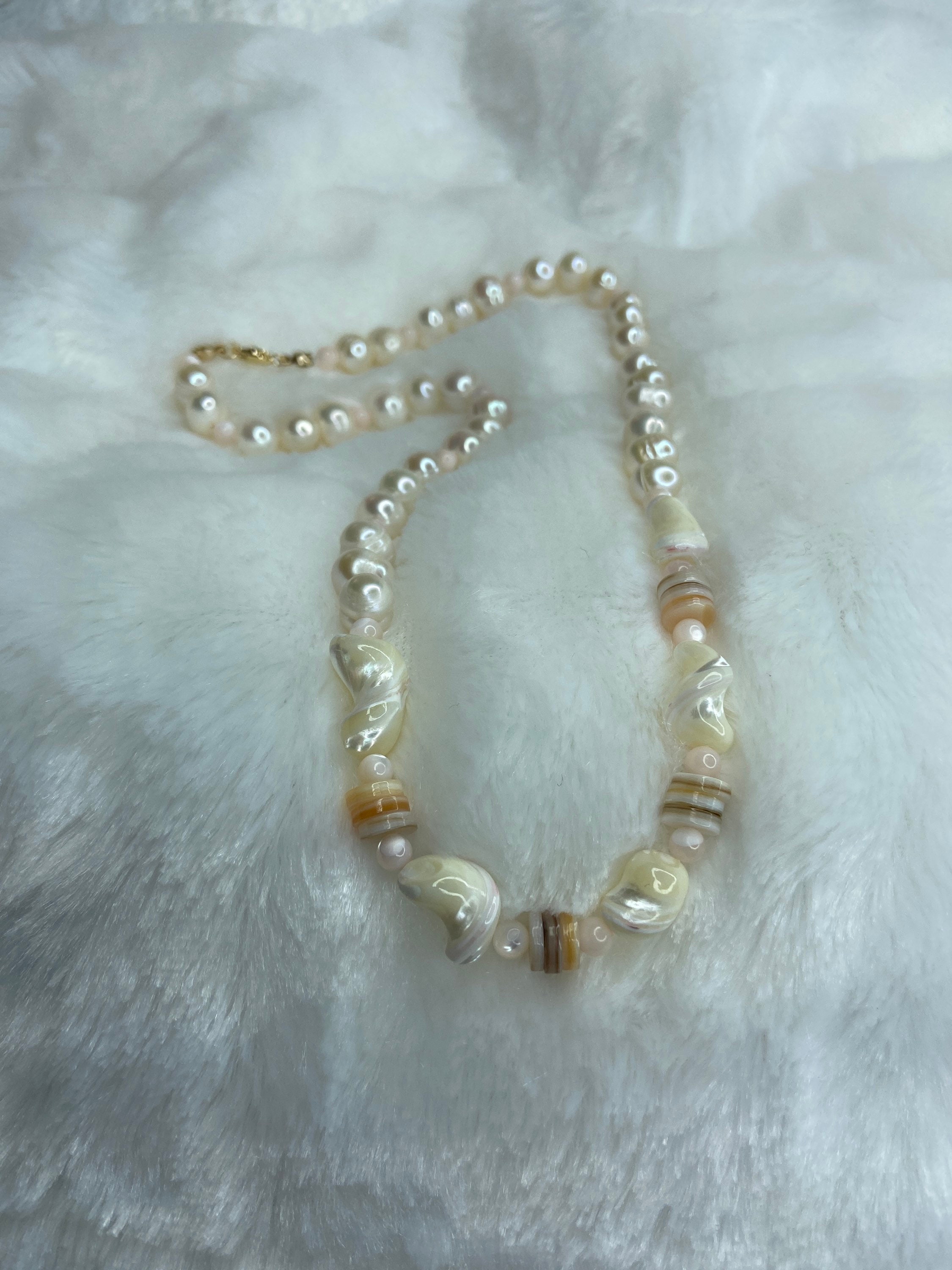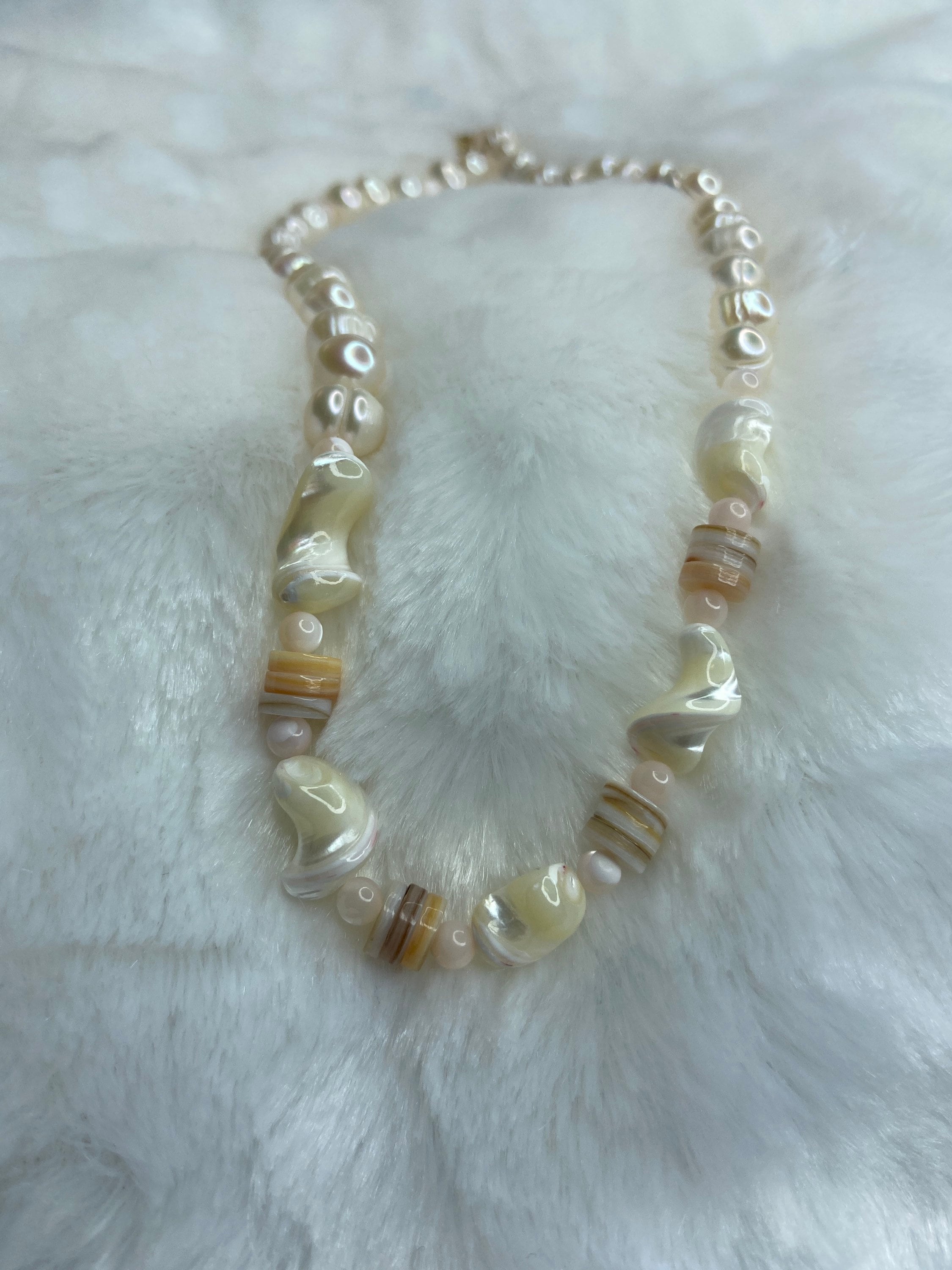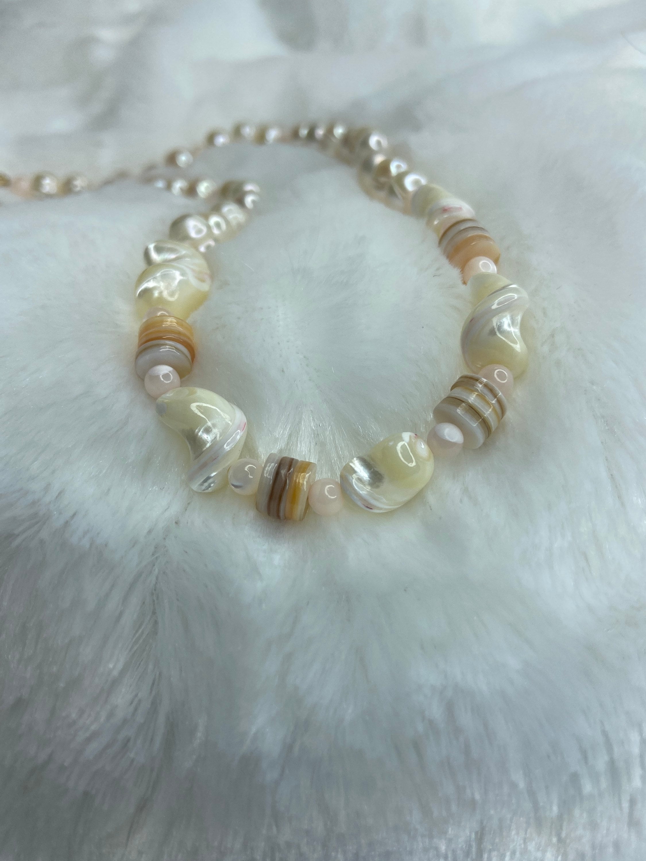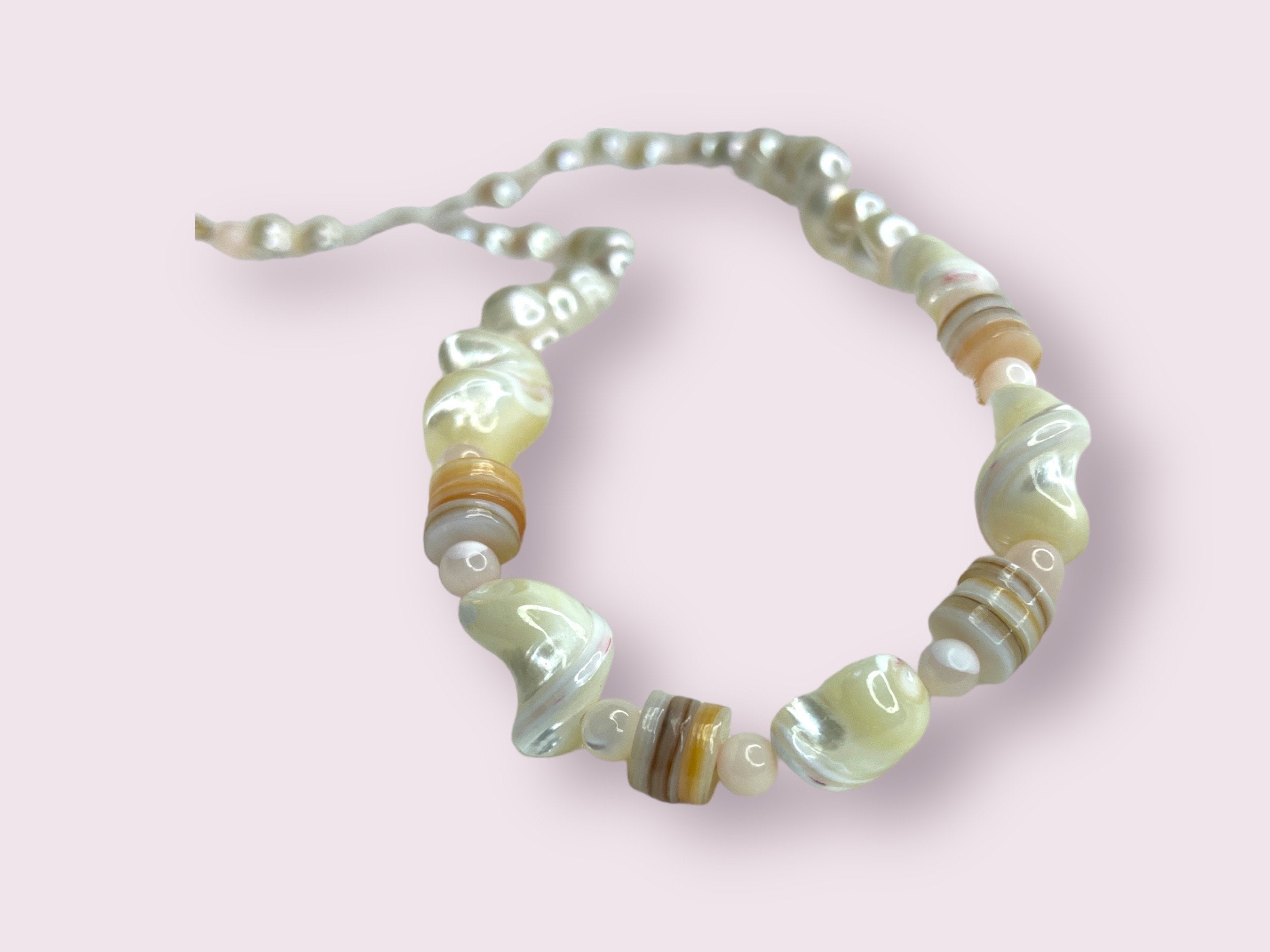 I use 8-9mm freshwater rice pearls along with light pink mother of pearl and shell beads.