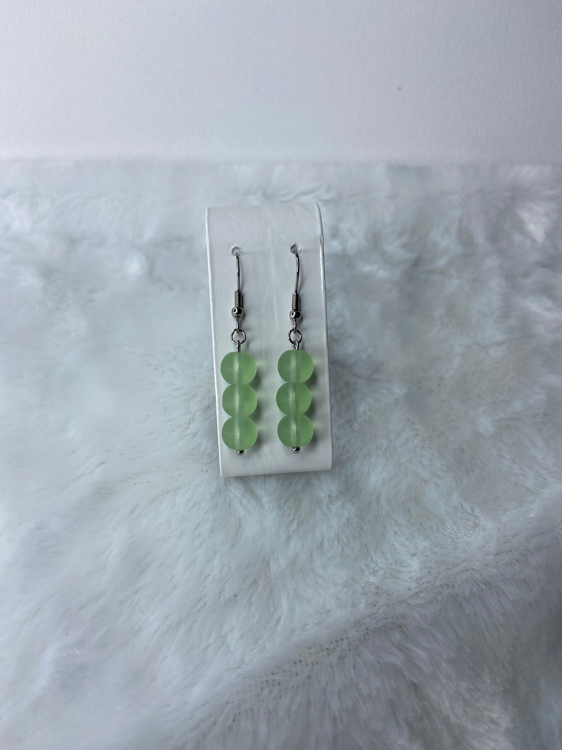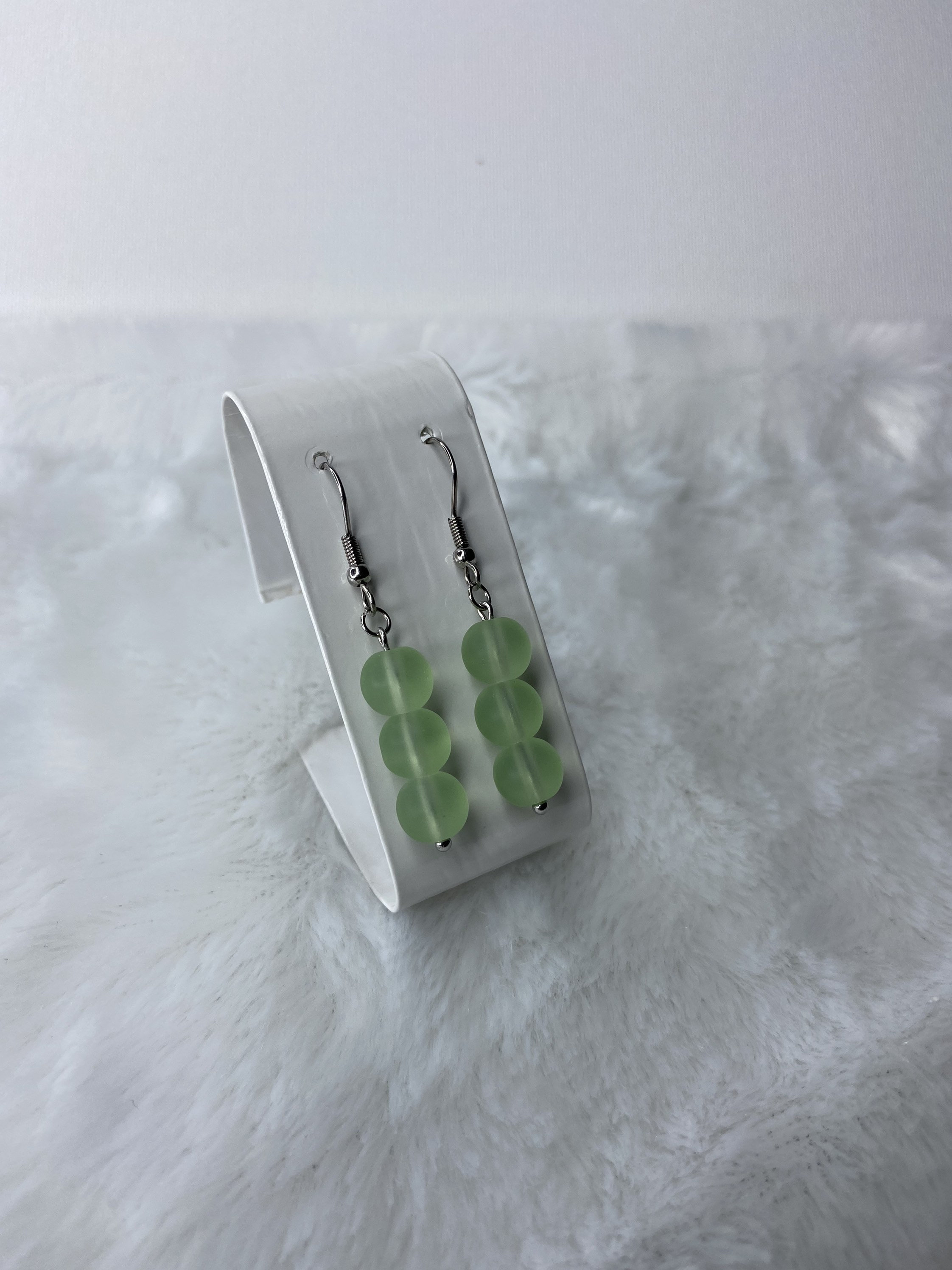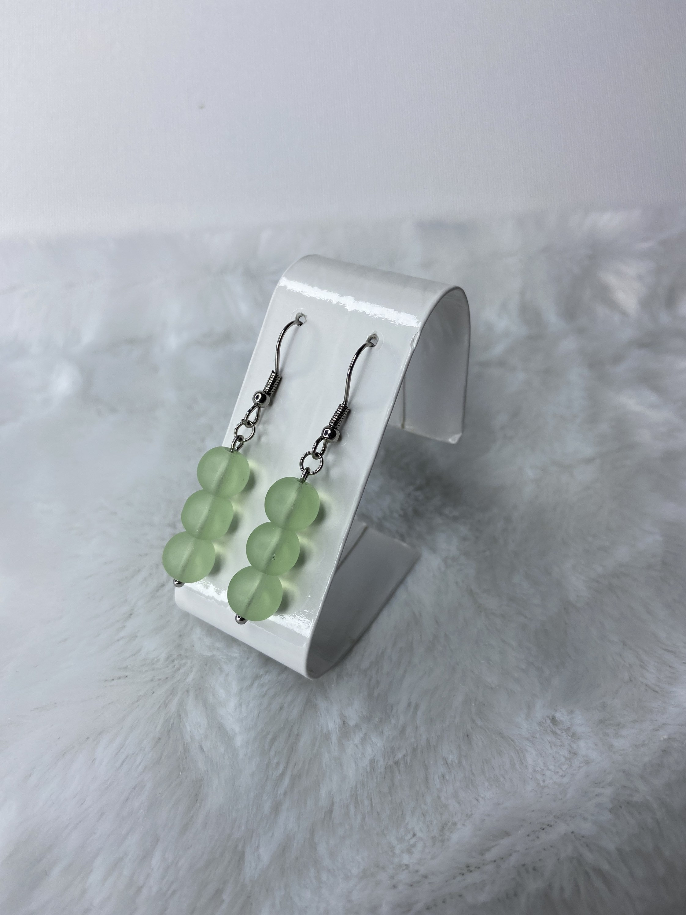 The green frost beads measure 8-10mm and the earrings dangle approximately 1.5” in total length.