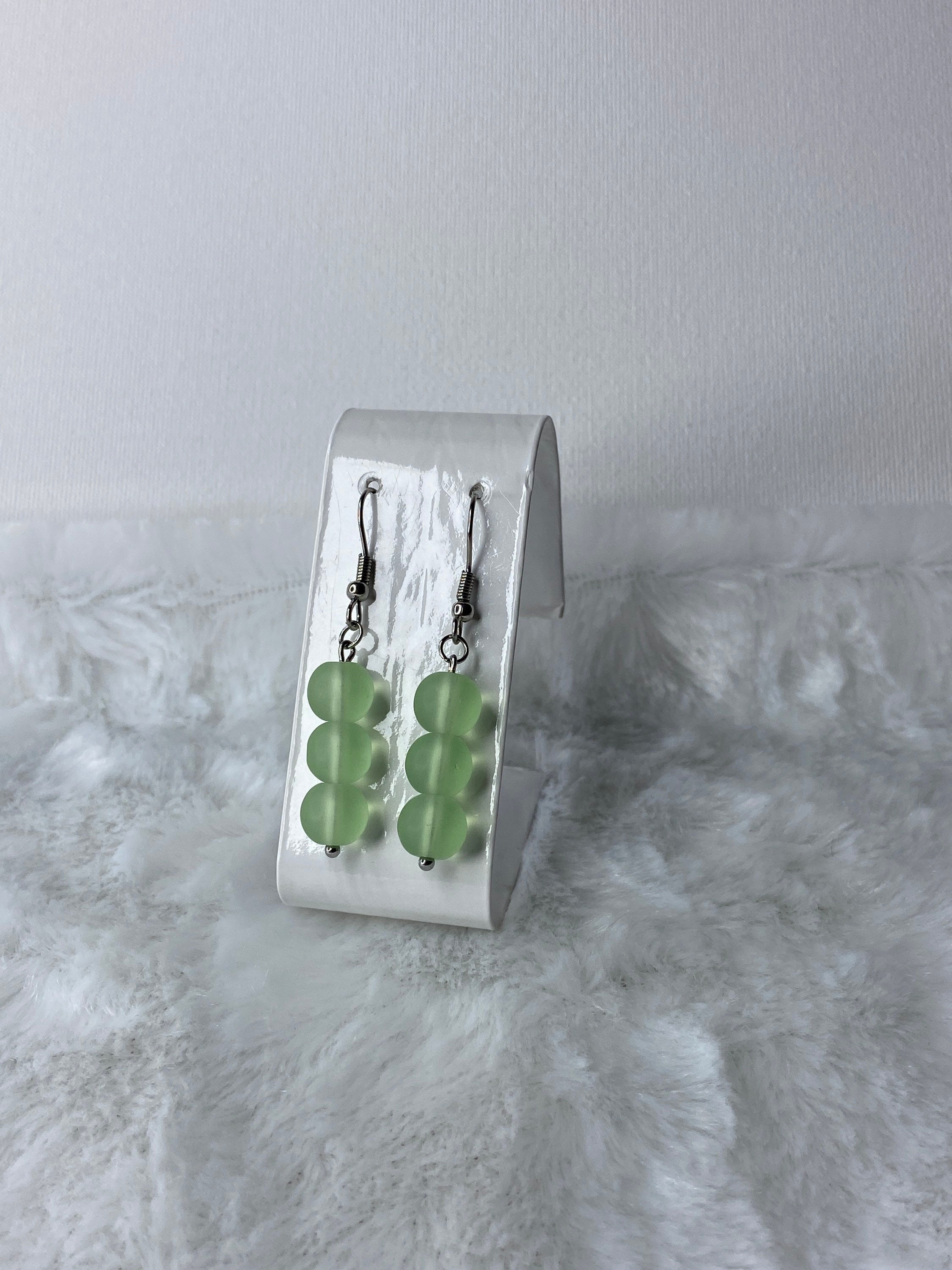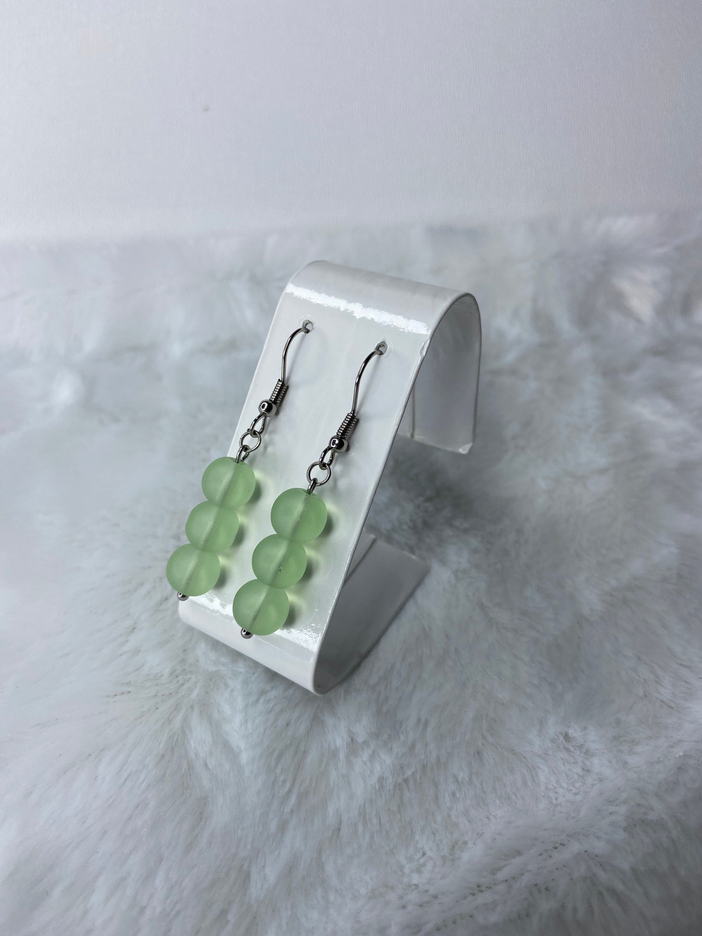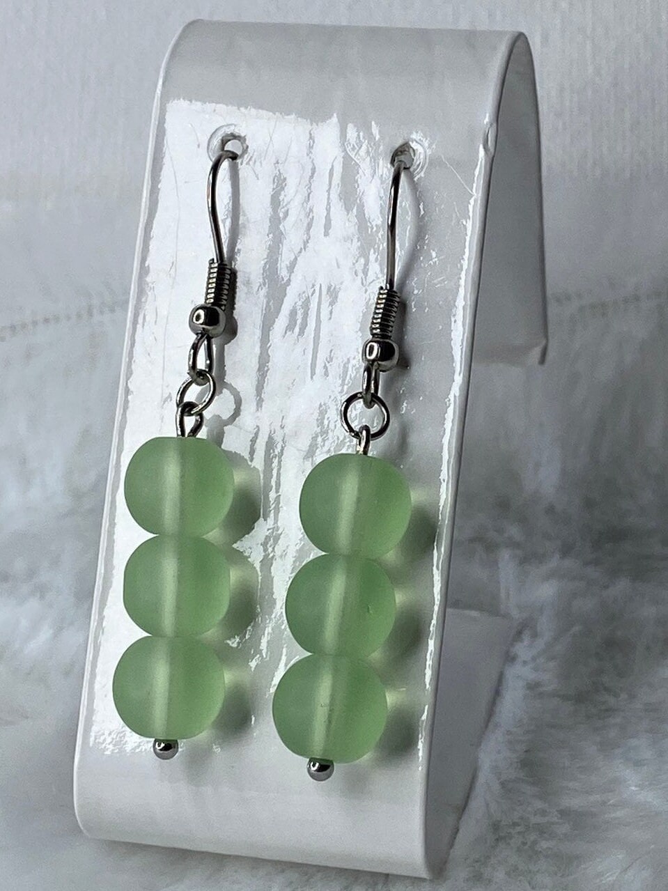 The green frost beads measure 8-10mm and the earrings dangle approximately 1.5” in total length.