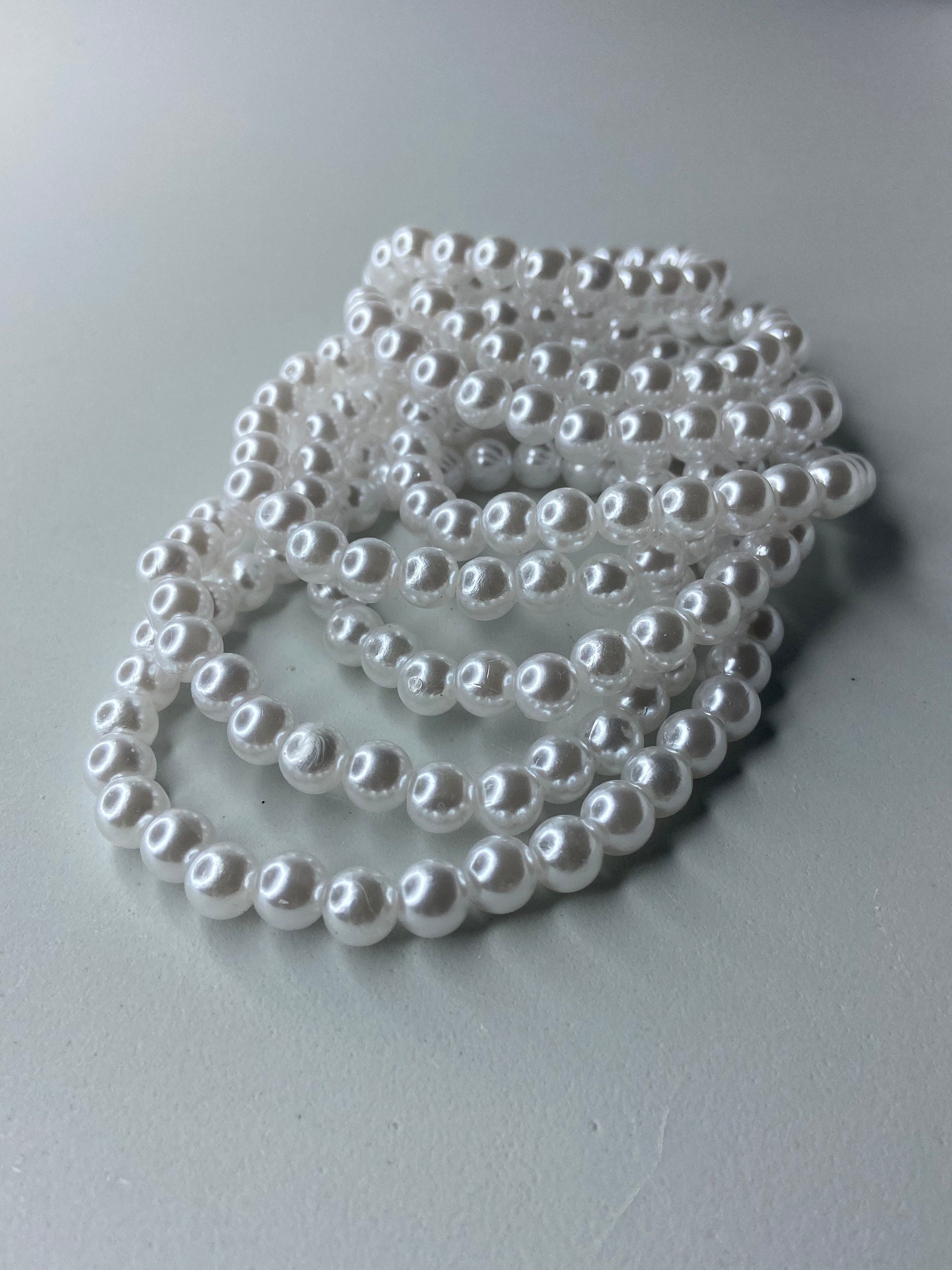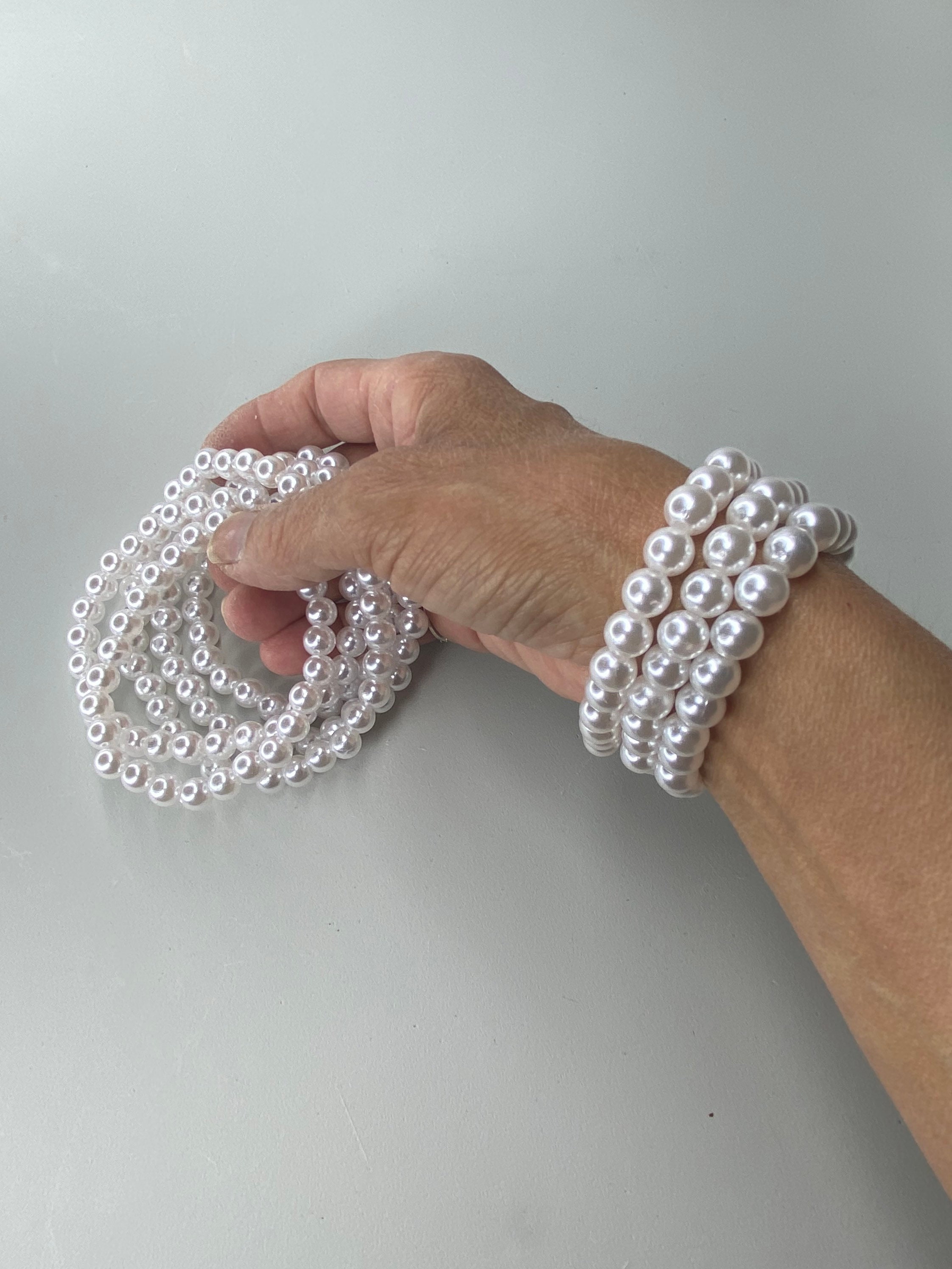 I use white faux pearls and three strands of stretch cord for these pearl bracelets.
