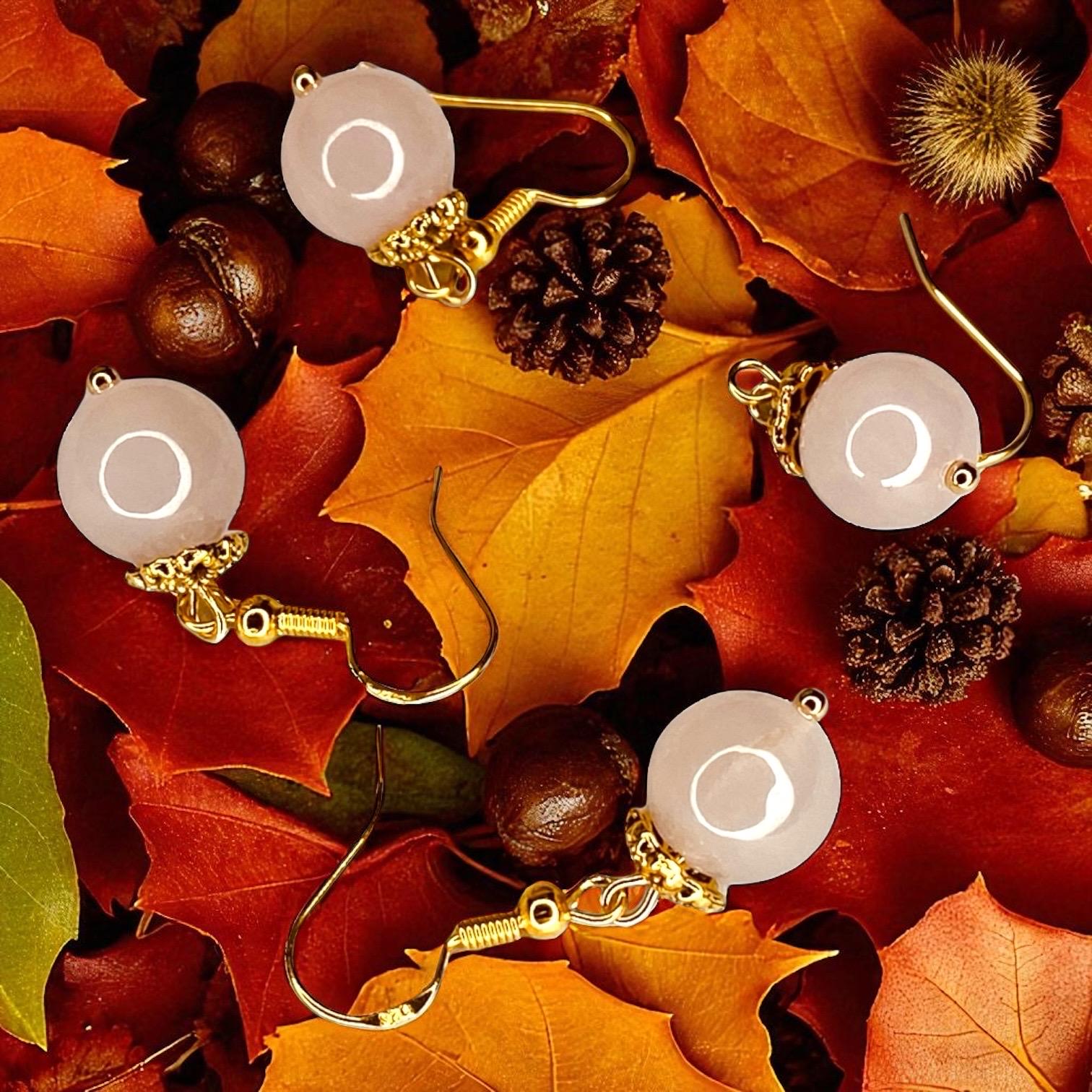 These dangling earrings feature smooth, non-faceted rose quartz gemstones measuring approximately 1 inch in length, attached to gold -plated hooks. The total length with hooks is about 1.35 inches. Each pair is handmade with attention to detail, ensuring each gemstone is securely wire-wrapped. The earrings are lightweight, making them comfortable for daily wear.