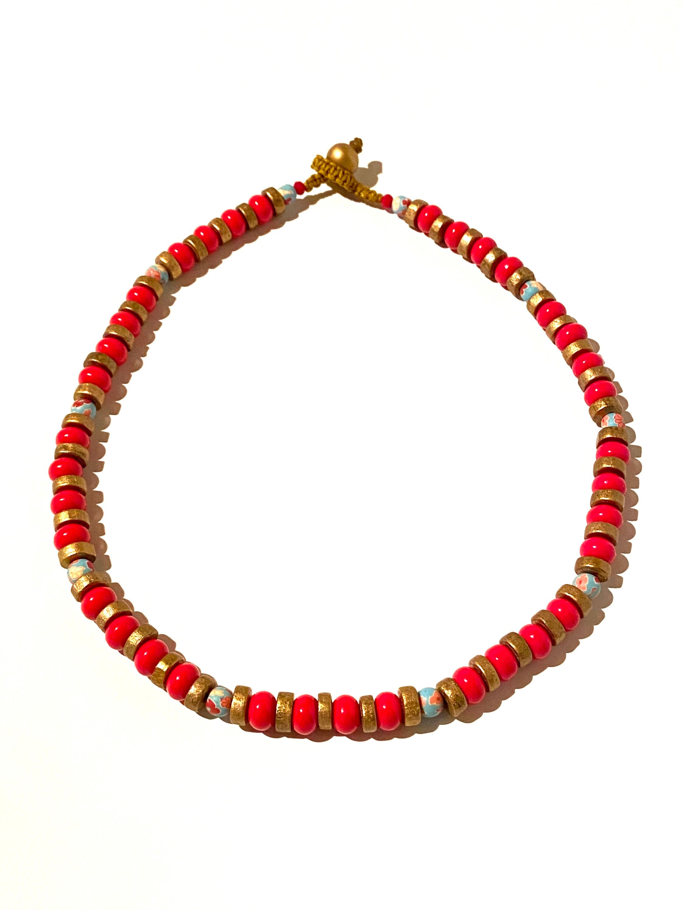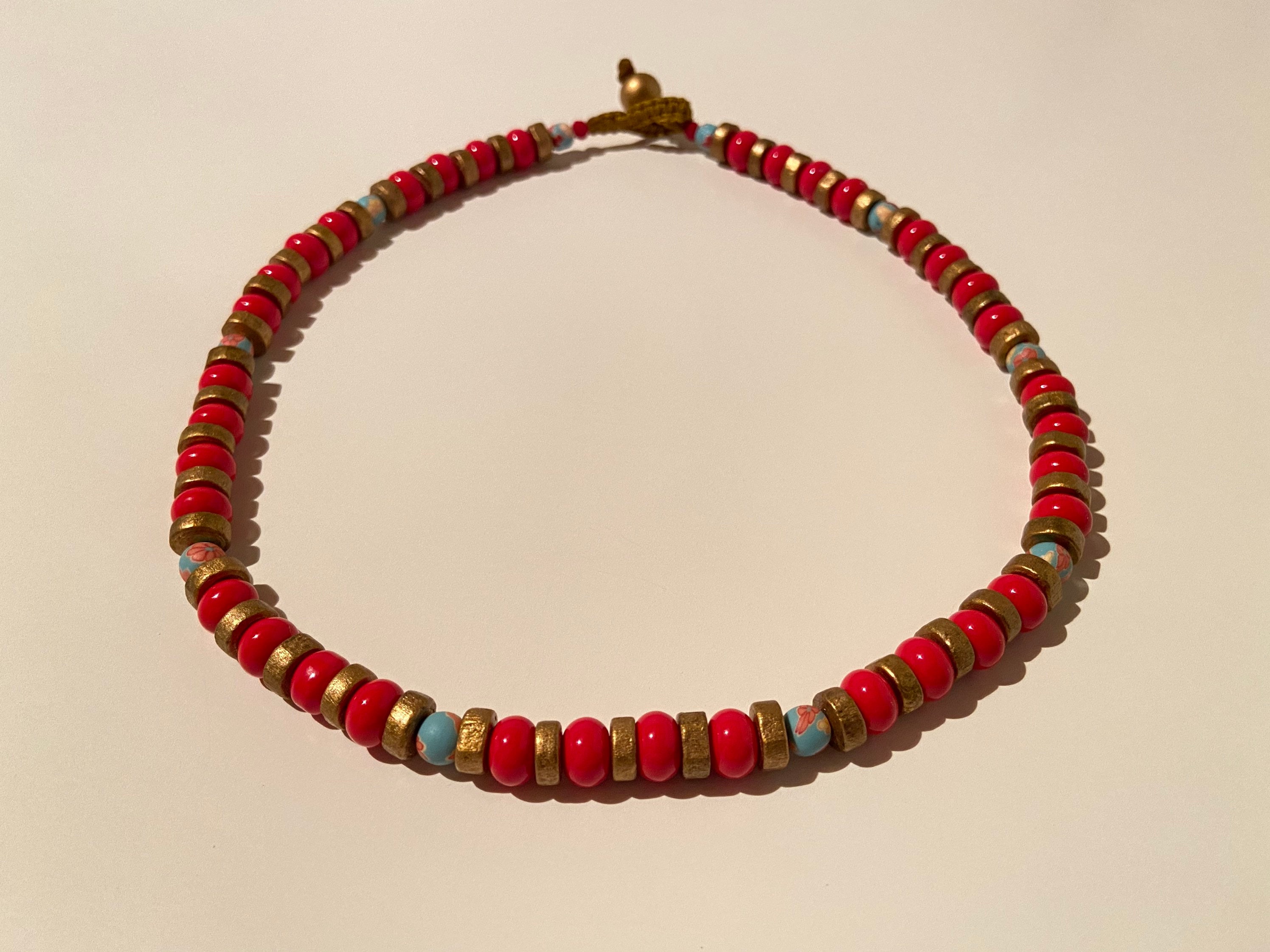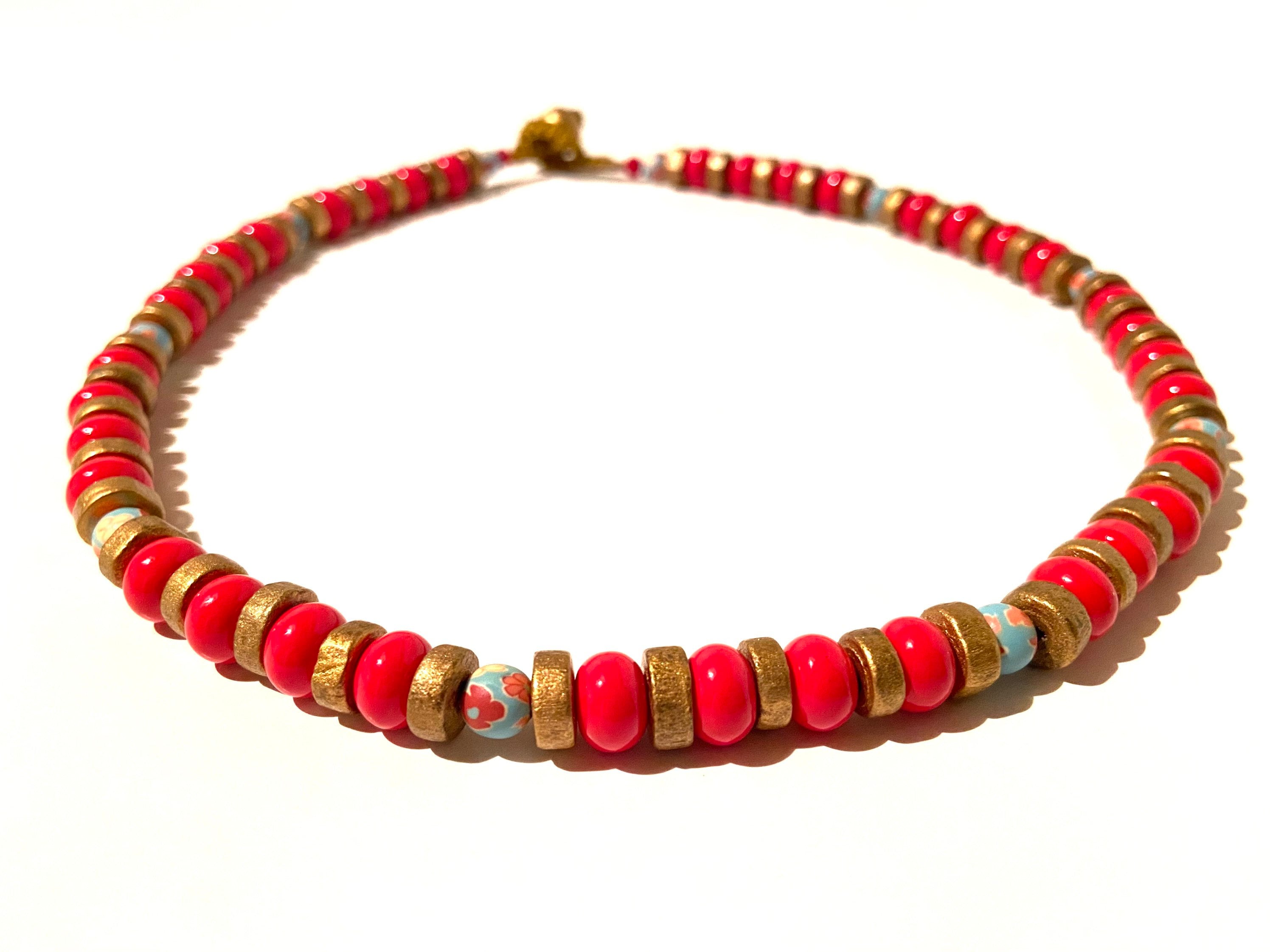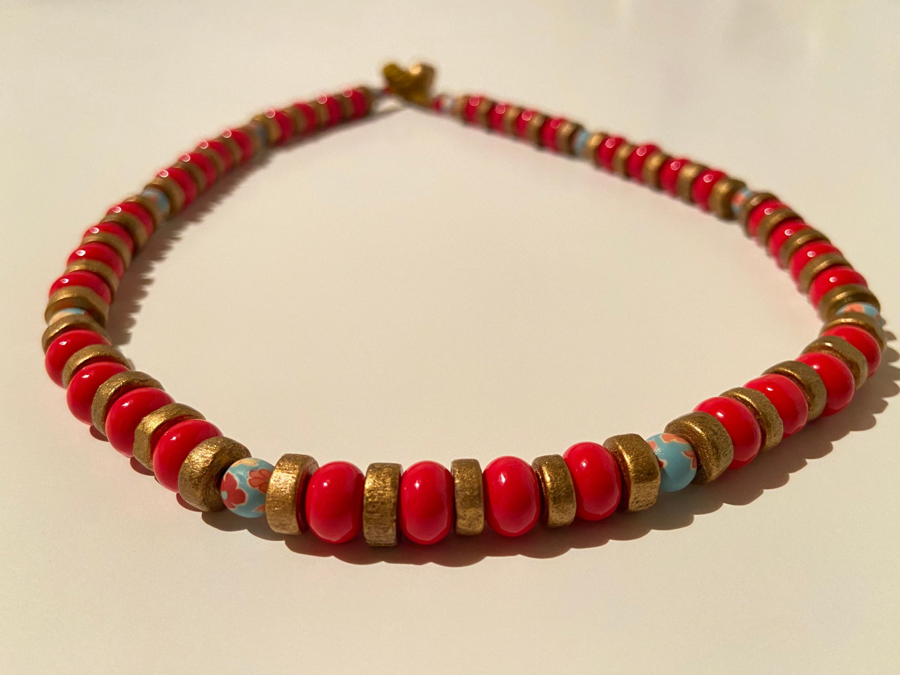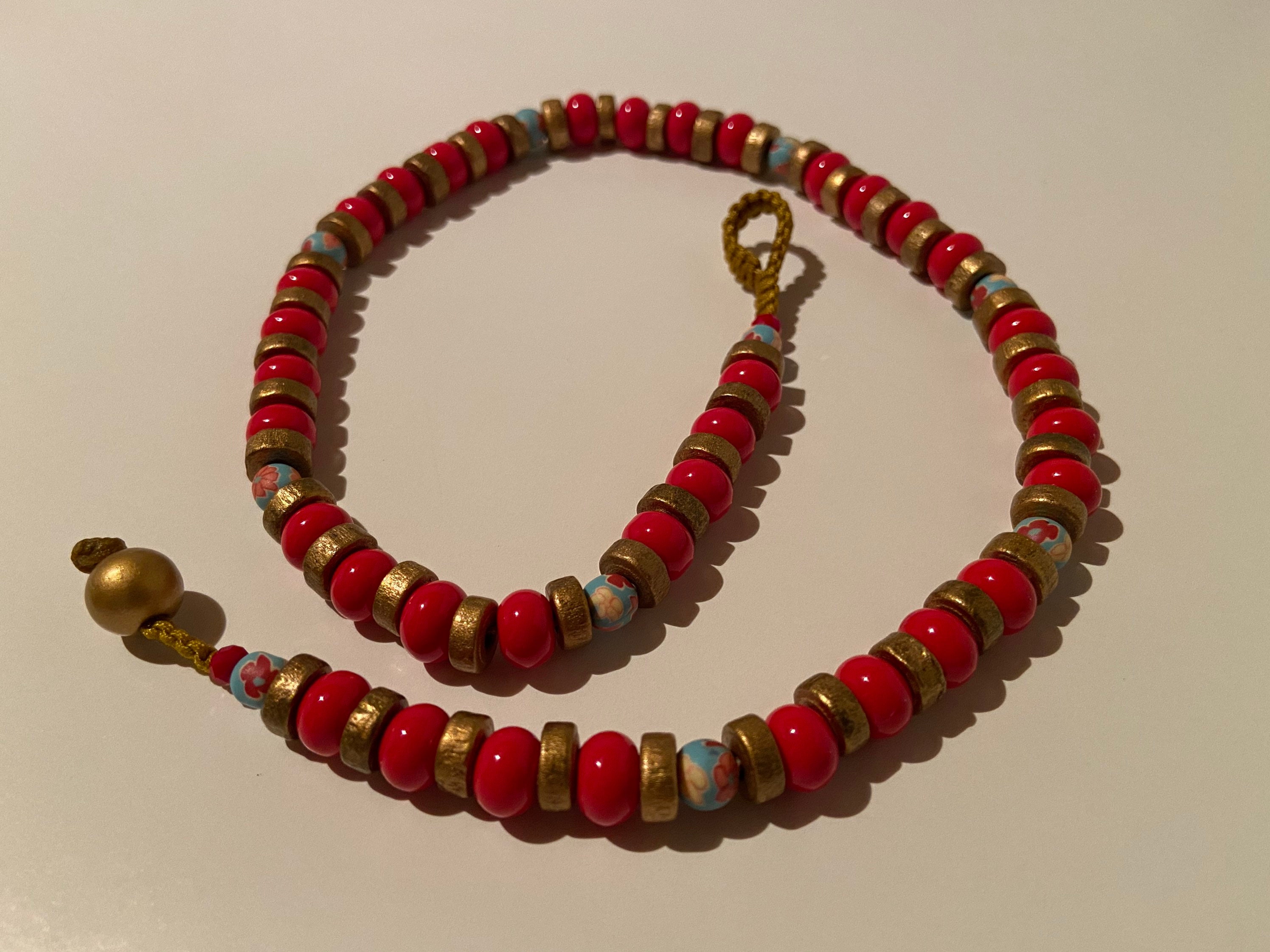 The necklace is adorned with red beads, flat gold wood beads and blue beads with hand painted flowers.