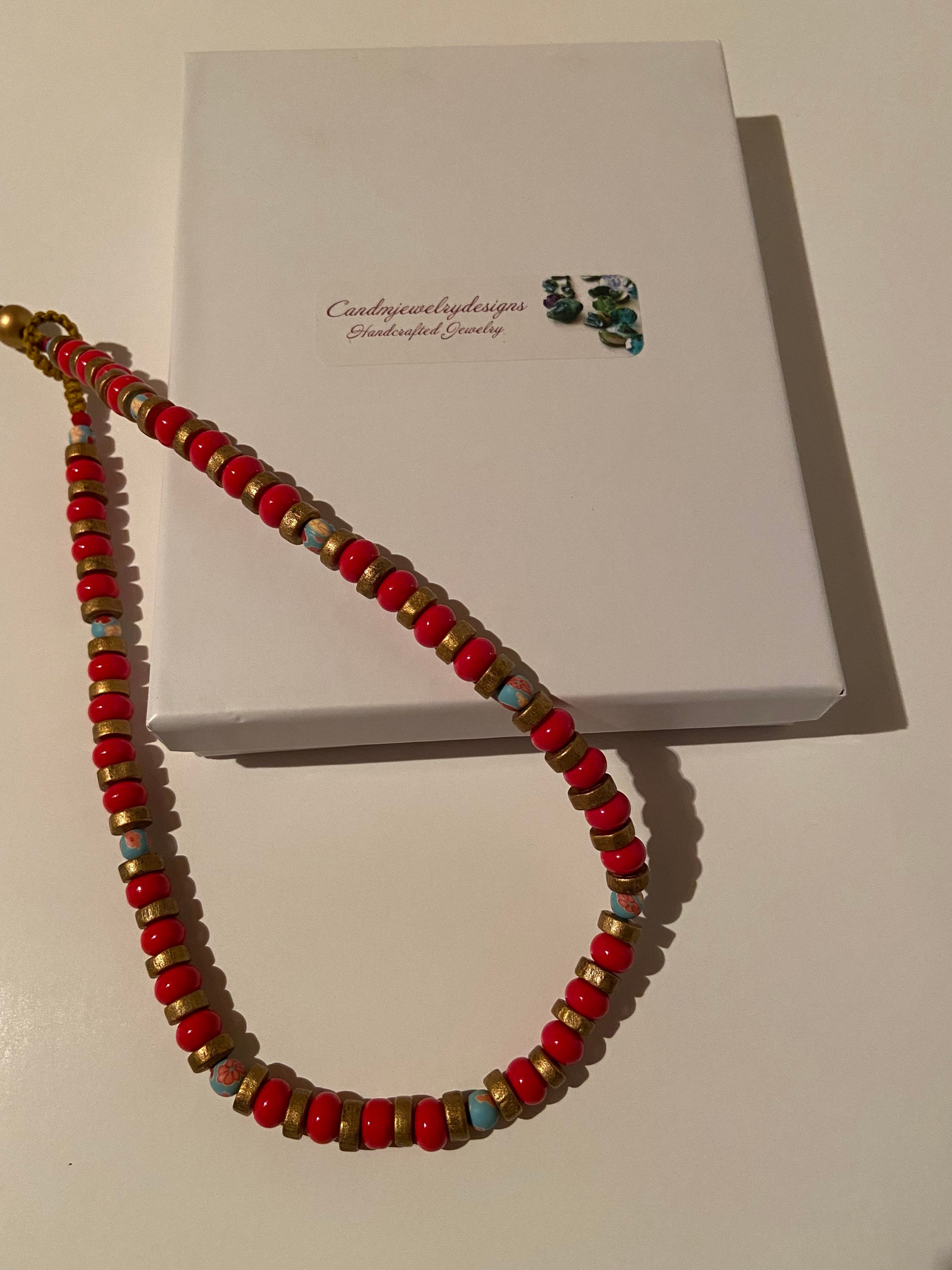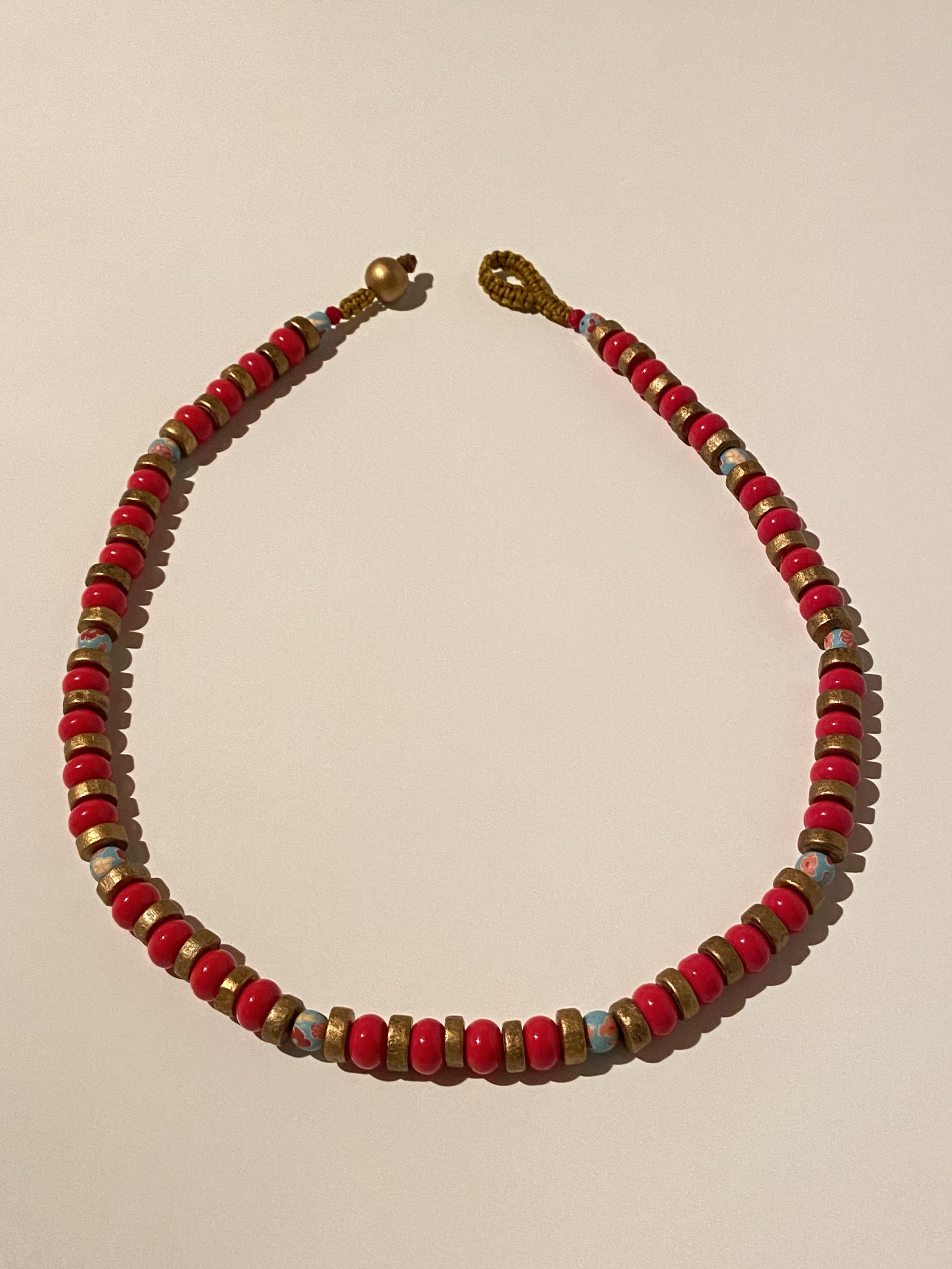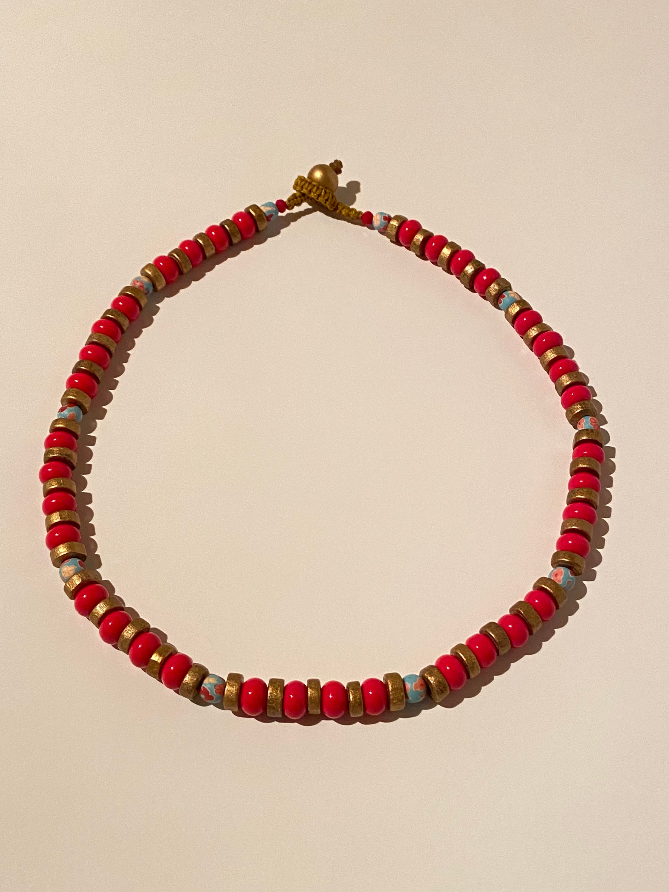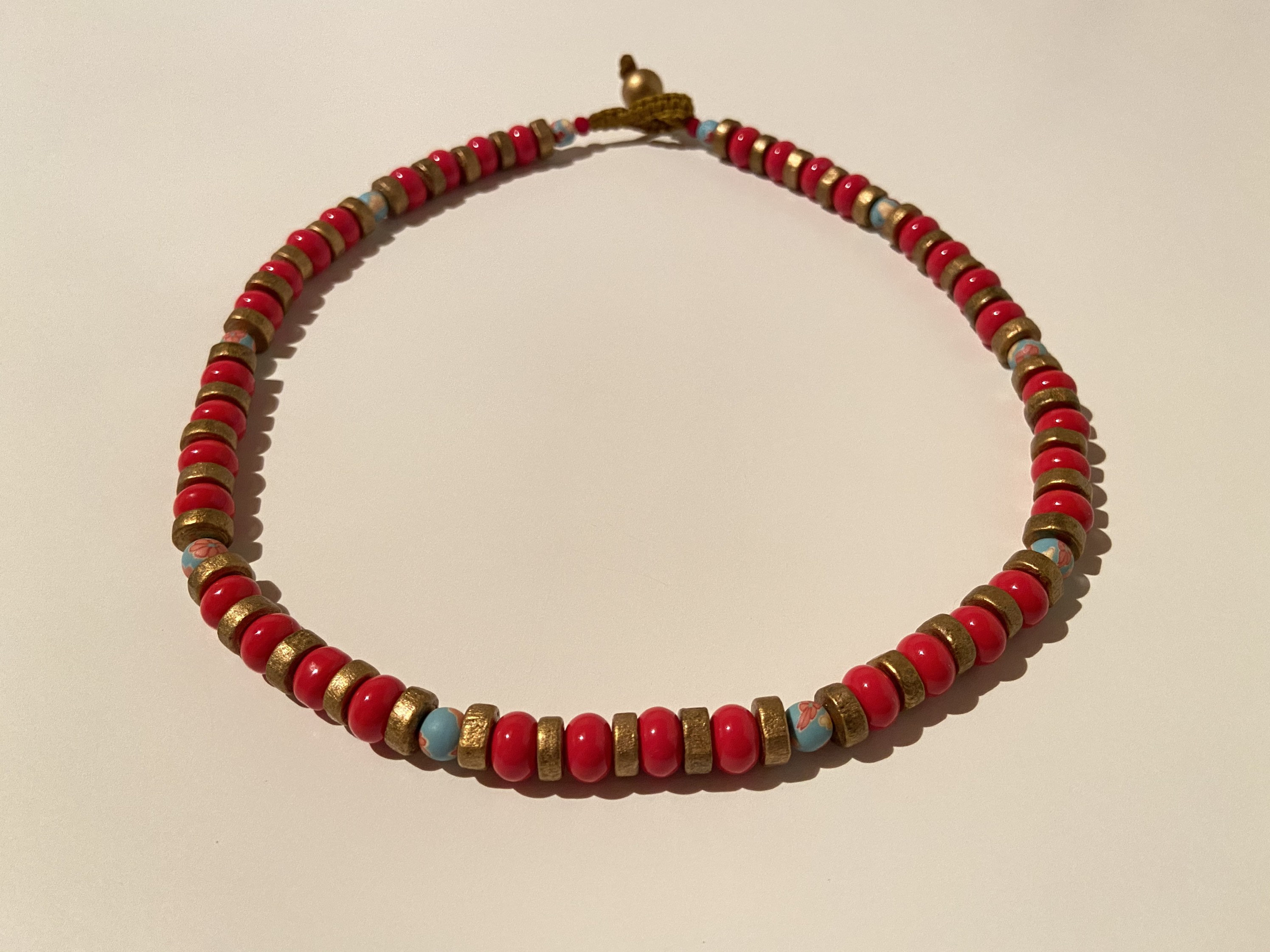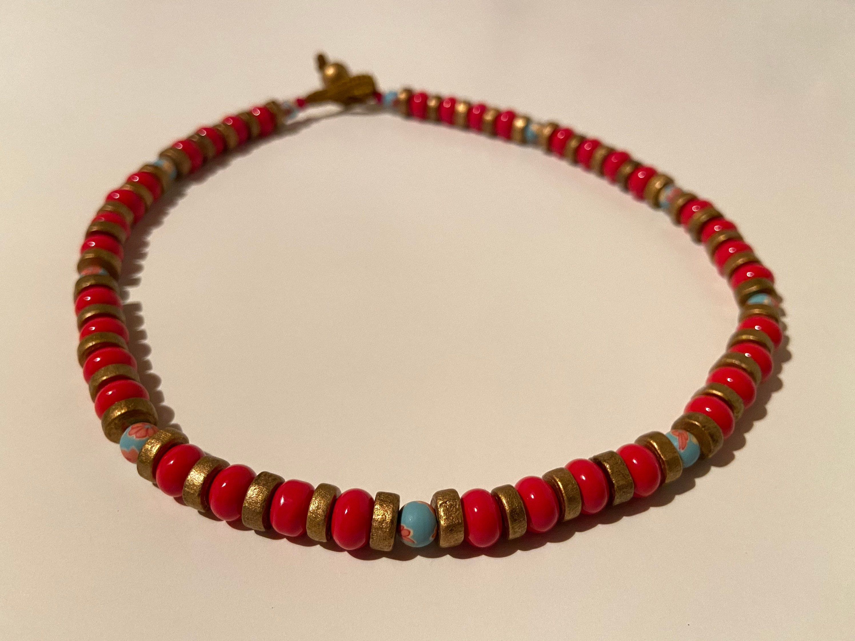 The necklace is adorned with red beads, flat gold wood beads and blue beads with hand painted flowers.