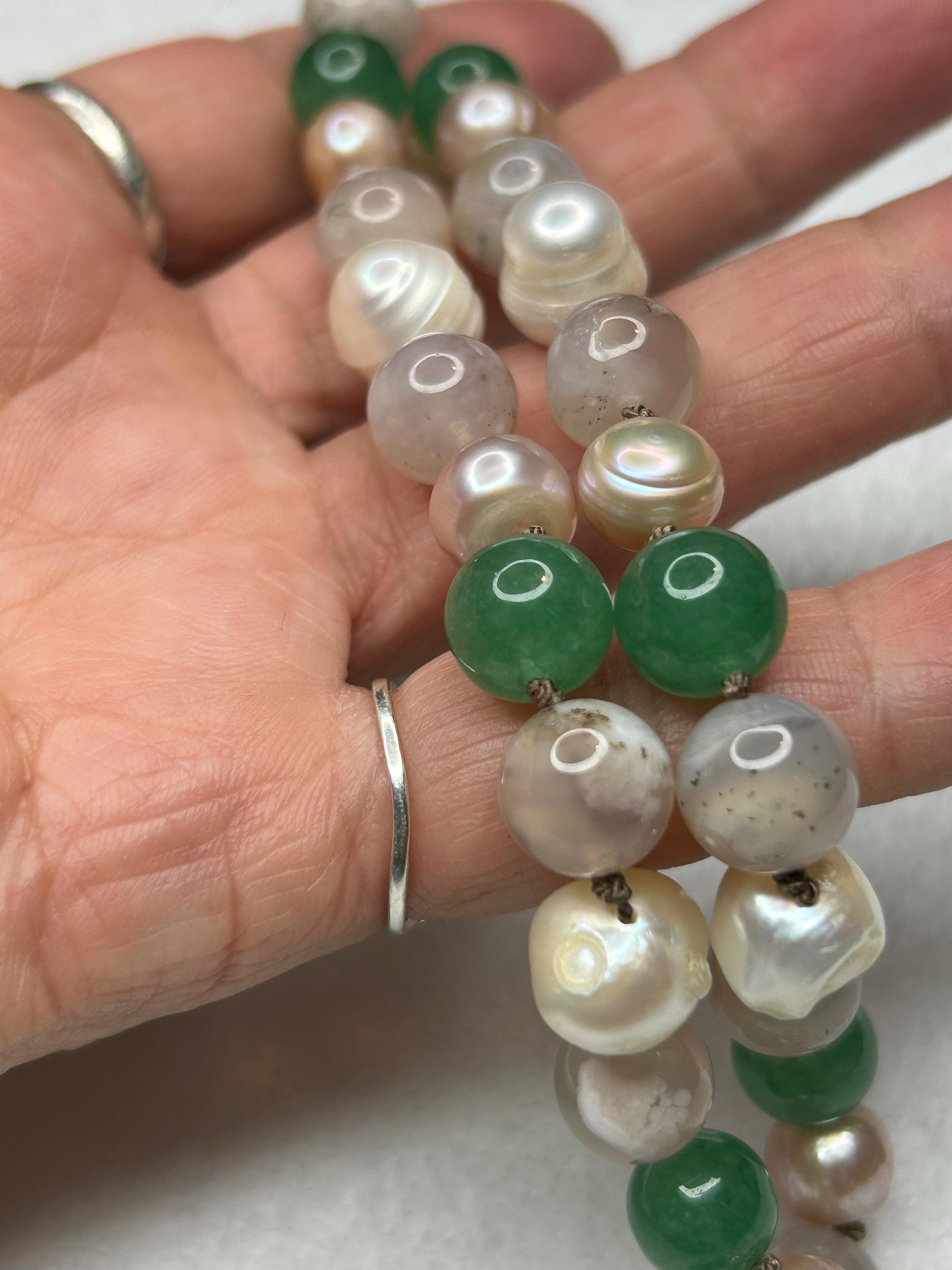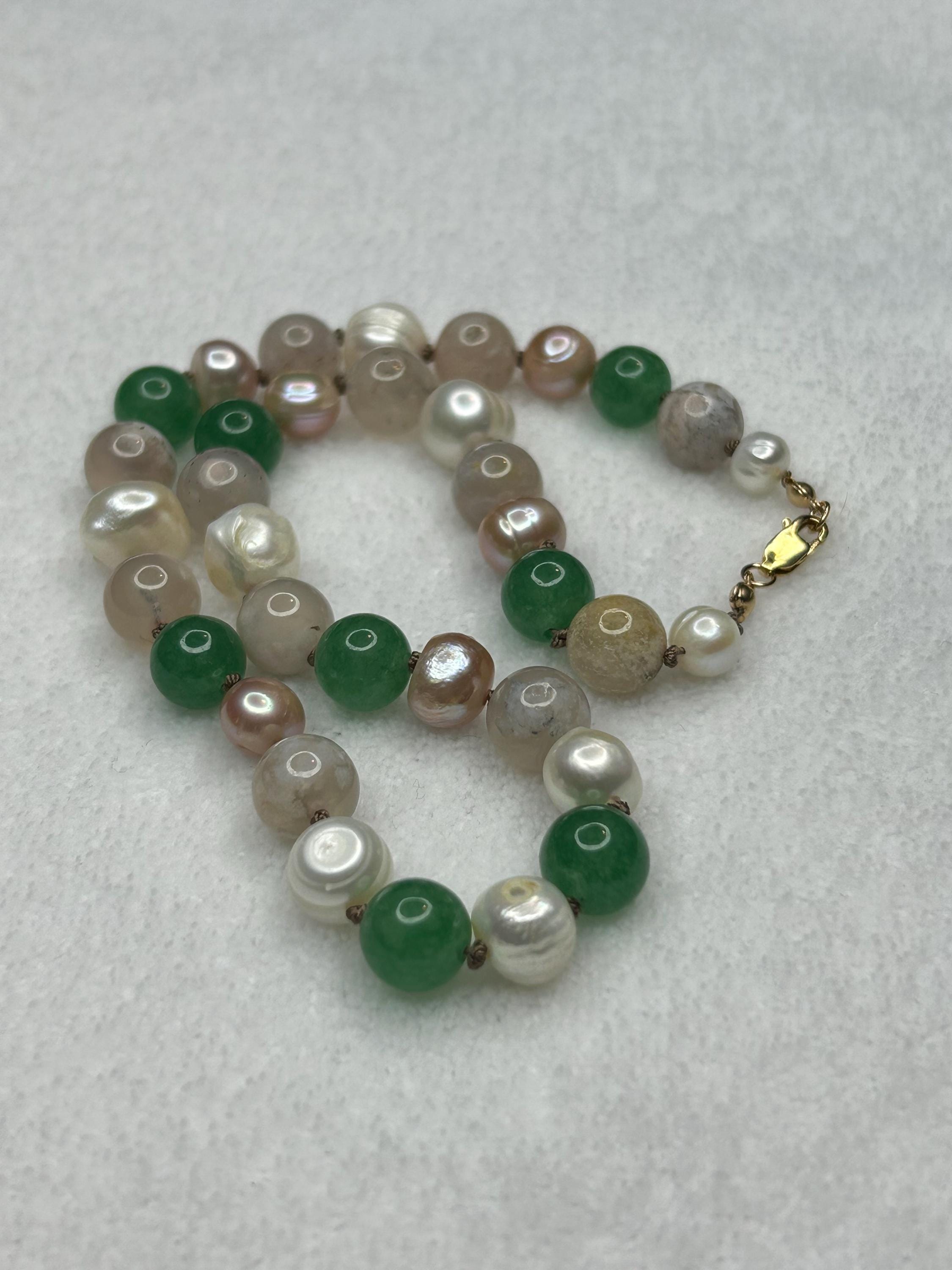 Elevate your jewelry collection with our exquisite Freshwater Pearl Choker Necklace, a stunning blend of elegance and sophistication. Handcrafted with care, this unique piece features lustrous freshwater pearls that radiate a soft glow, perfectly complemented by vibrant flower agate and green aventurine gemstones. Each element is meticulously chosen to create a fresh and contemporary look, making it an ideal accessory for any occasion.