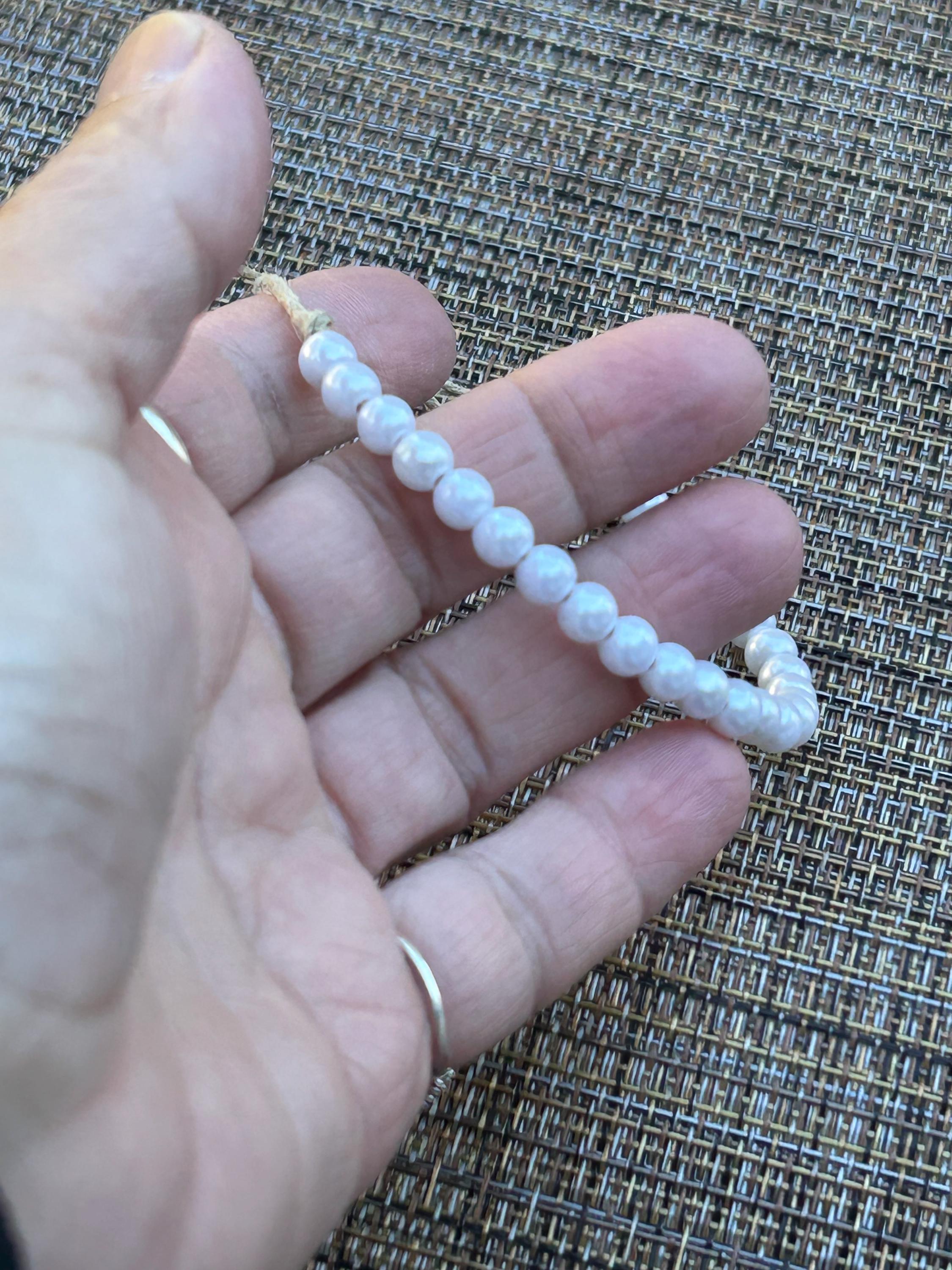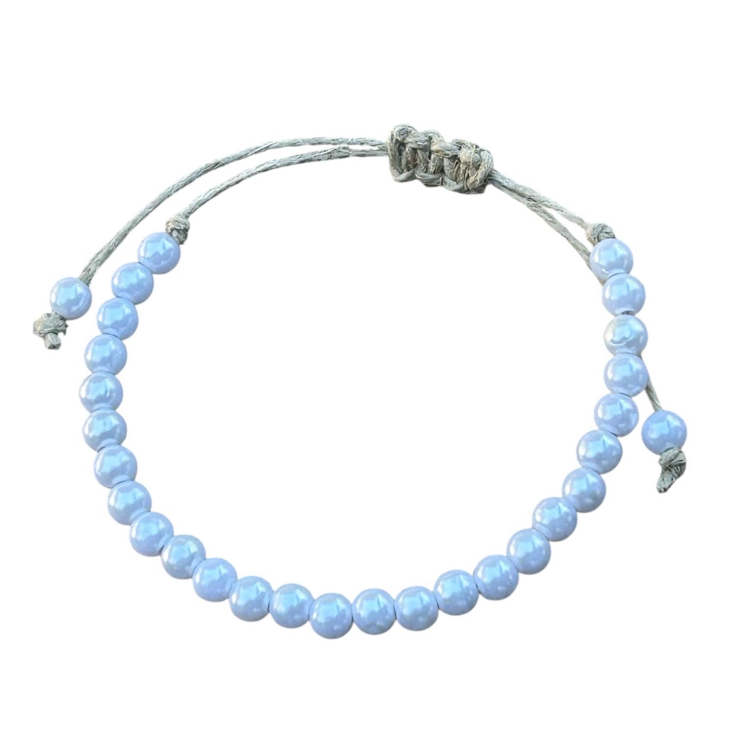 This bracelet is sturdy and adorned with your choice of beige (bone/white) or pure white faux pearls.
