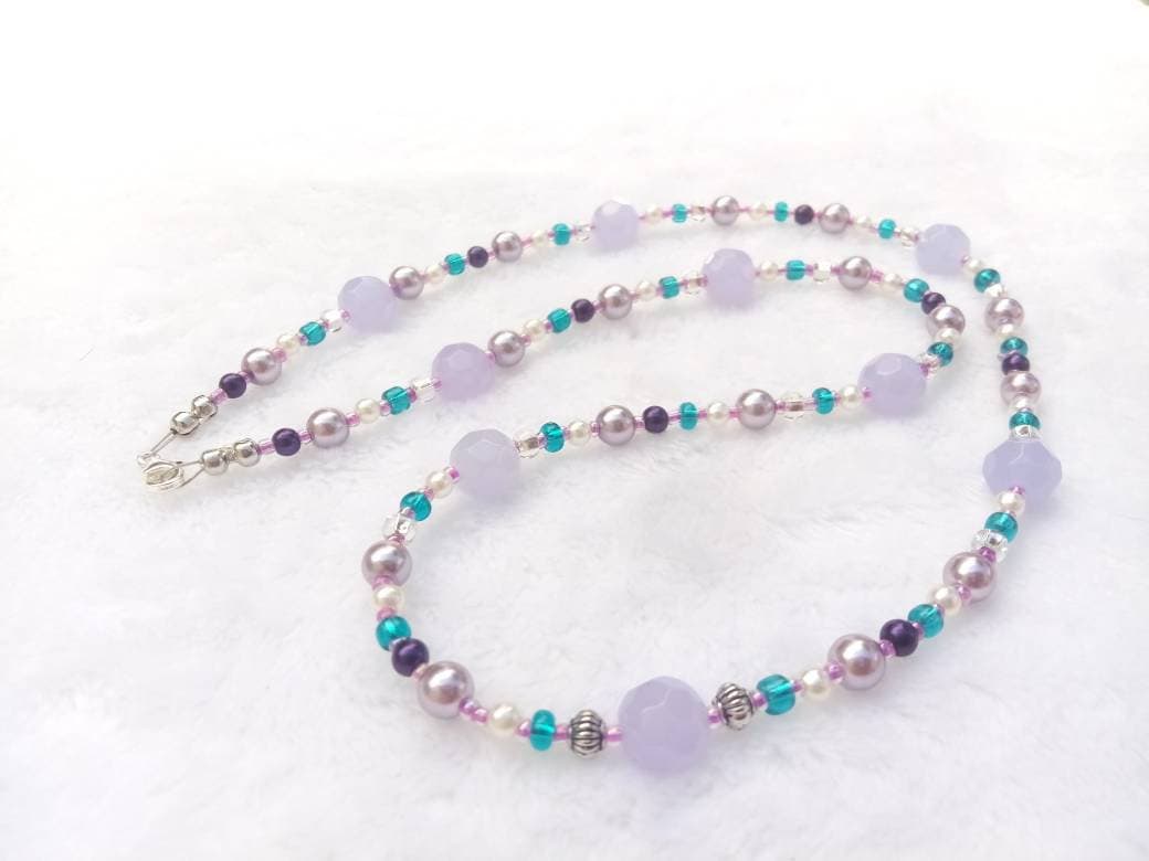 I use opaque amethyst beads, pearls, and glass turquoise beads to create this amethyst crystal necklace.