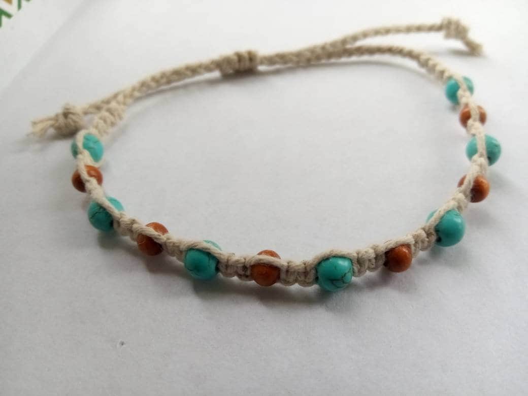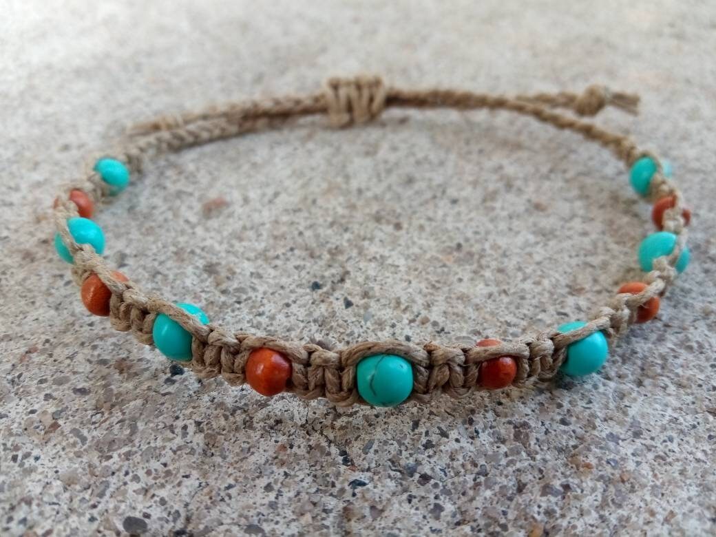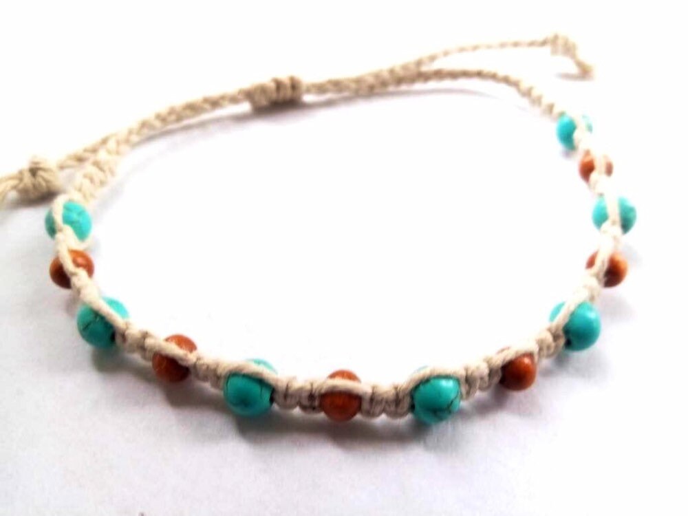 This turquoise and wood bead hemp bracelet is handmade.