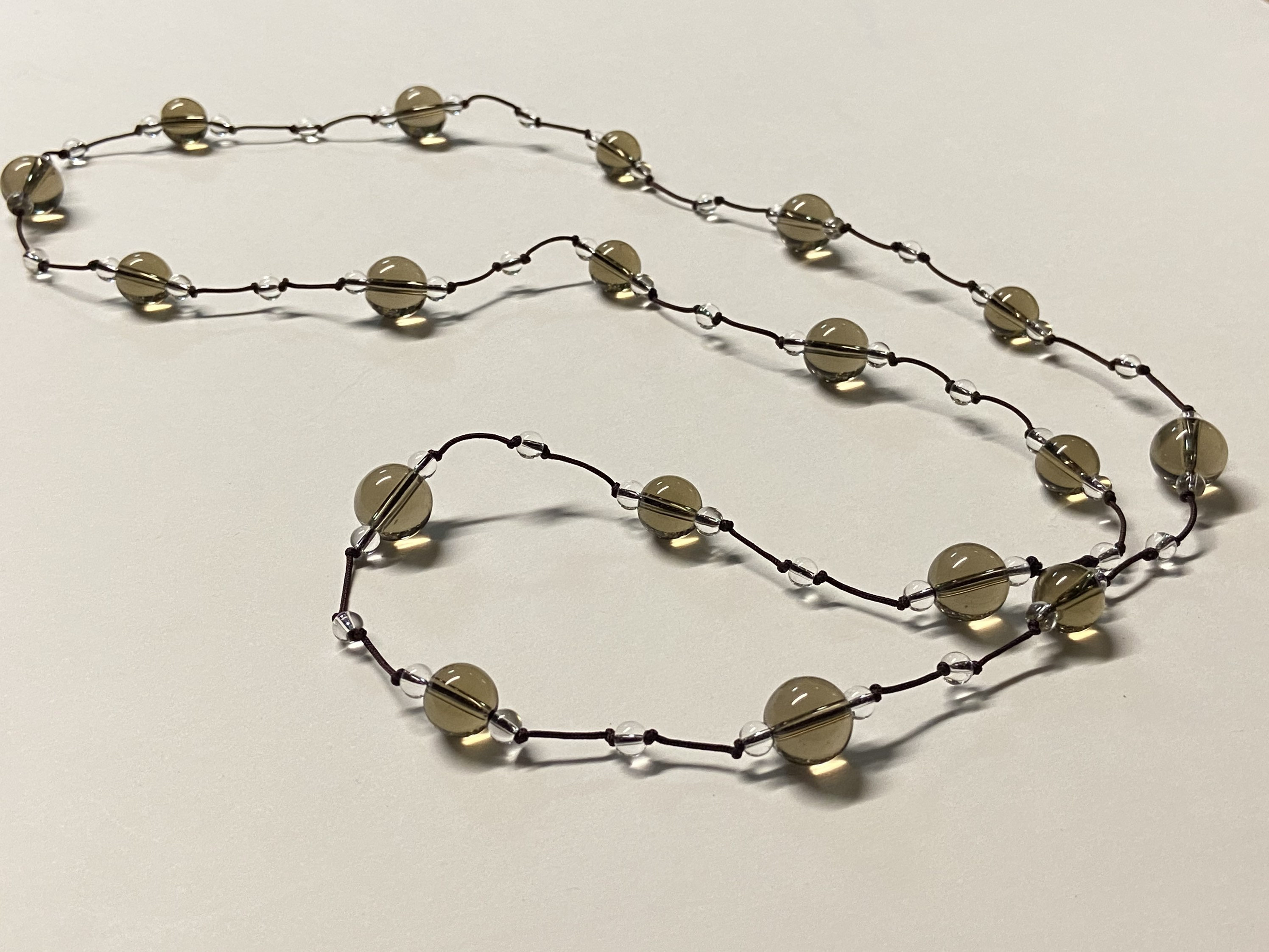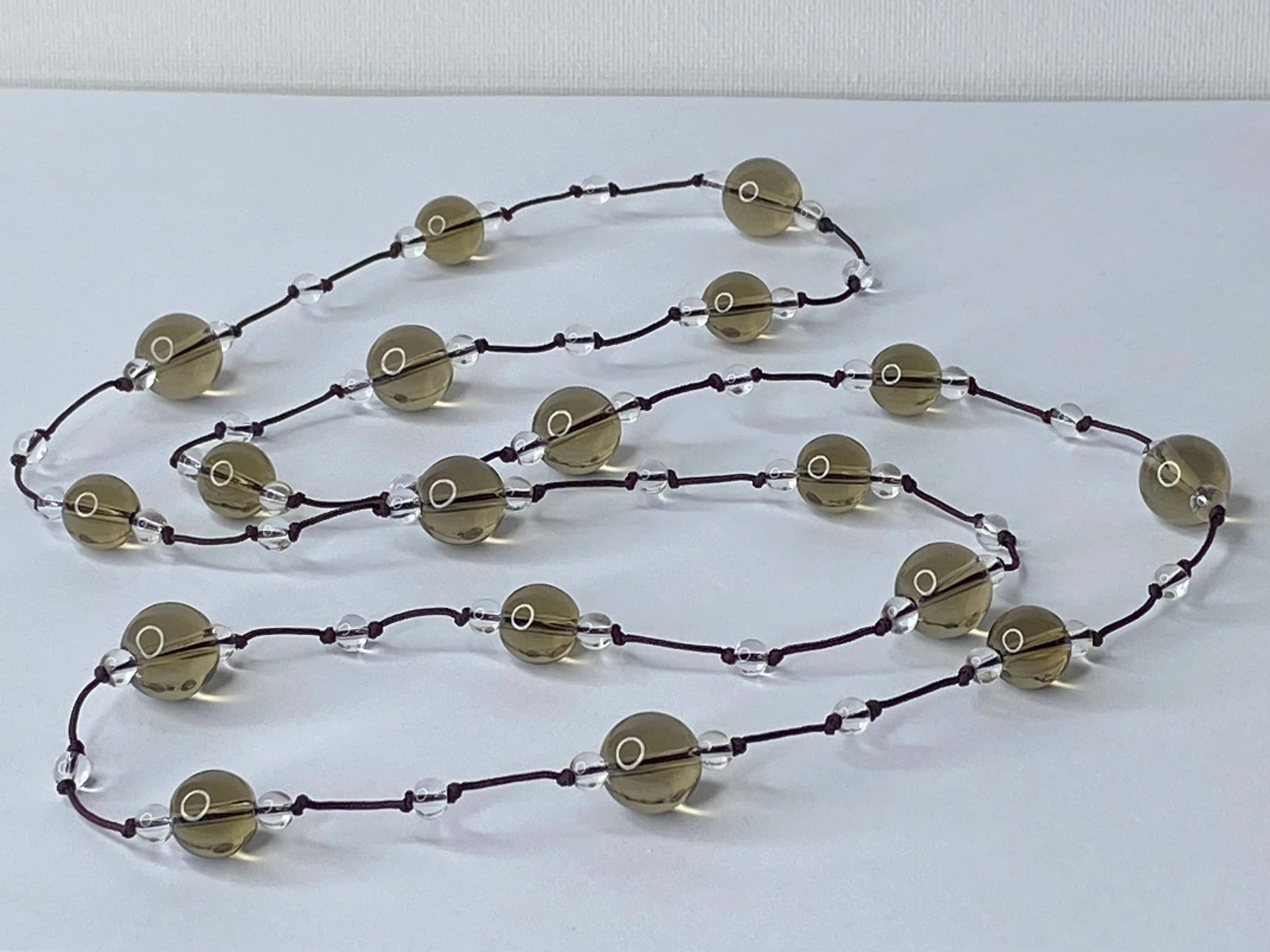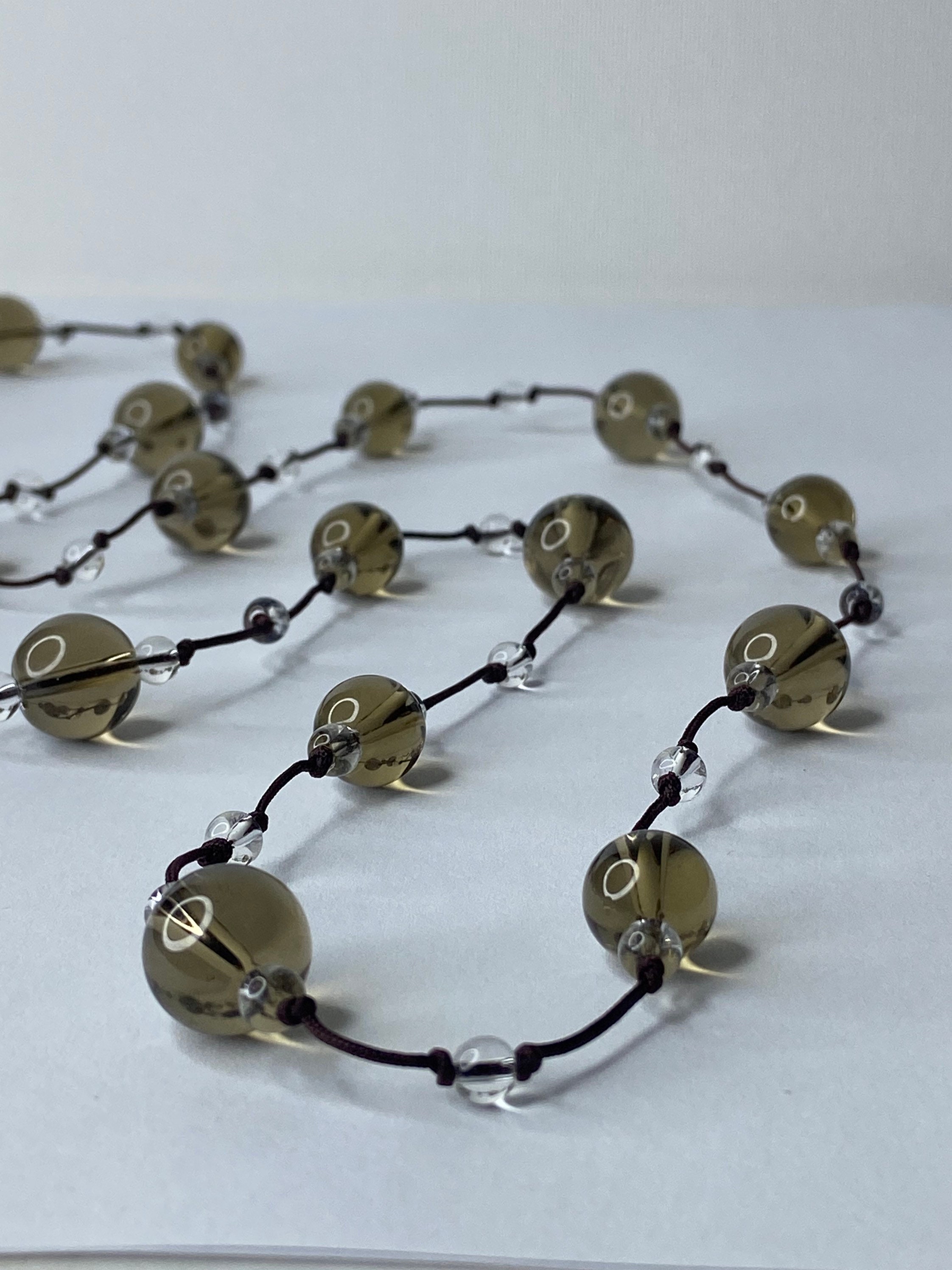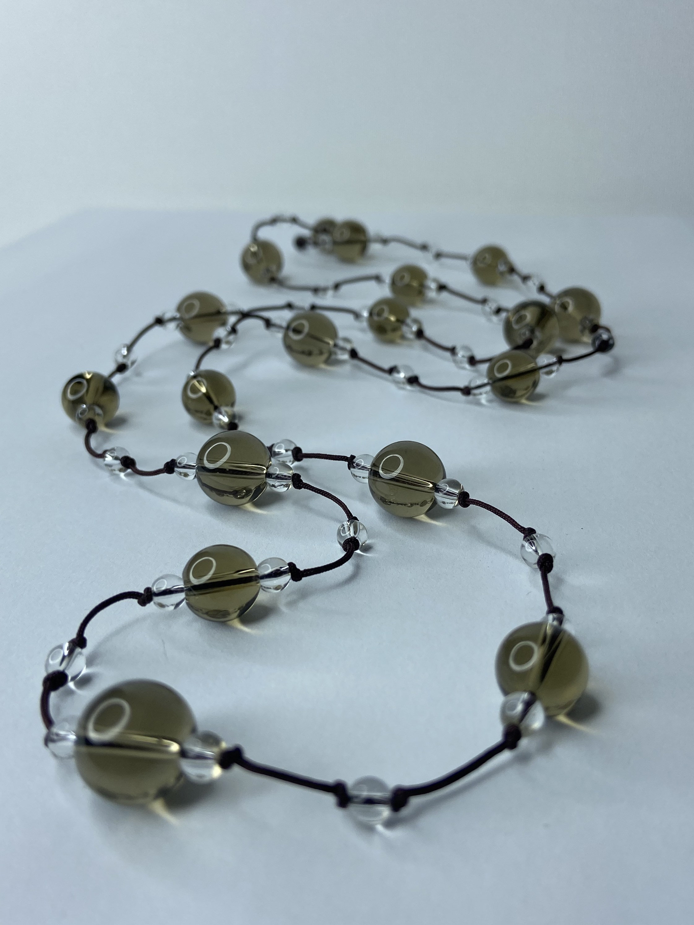 I use 10mm and 12mm smoky quartz and clear quartz to create this unique necklace.