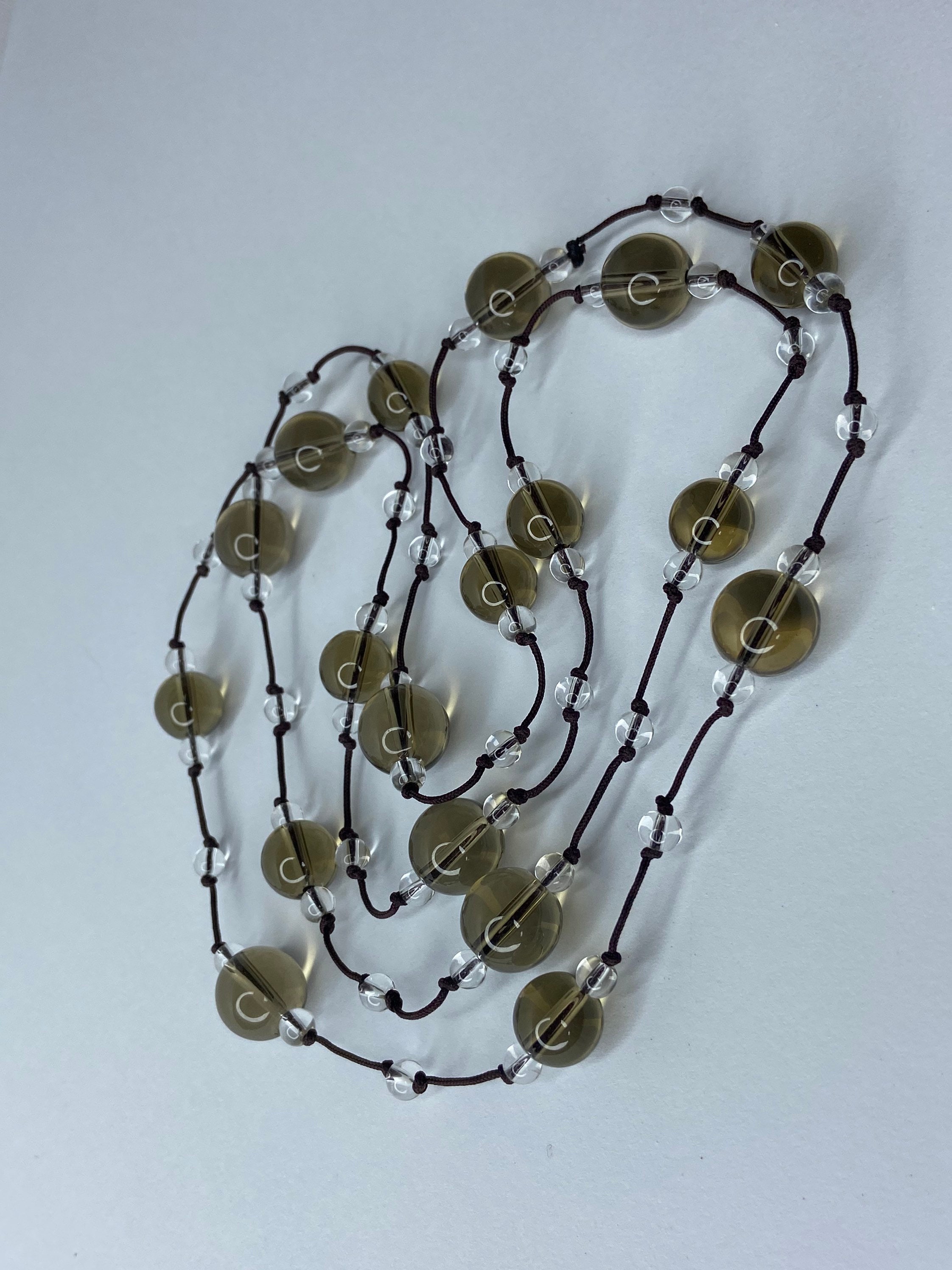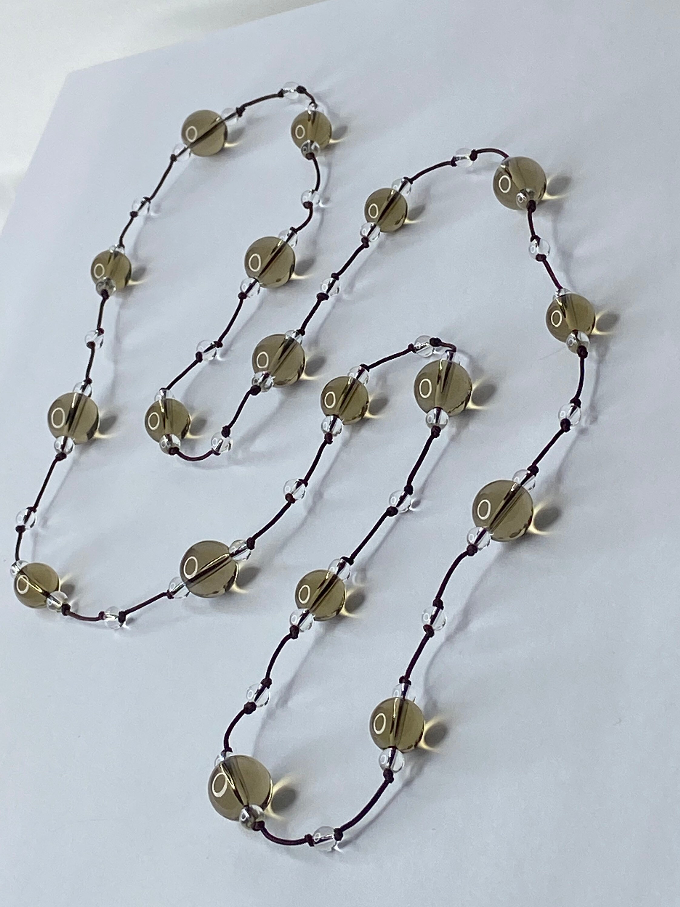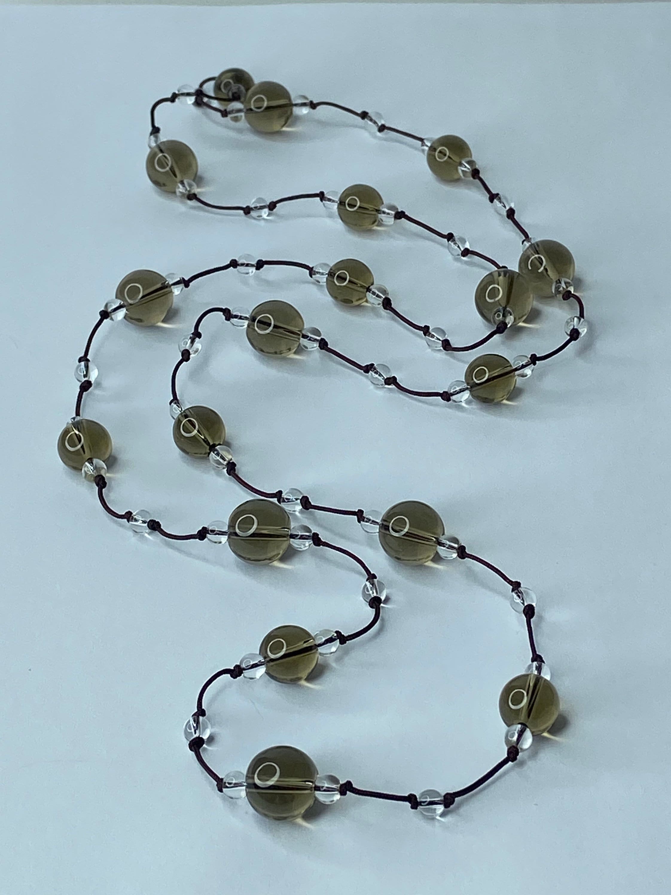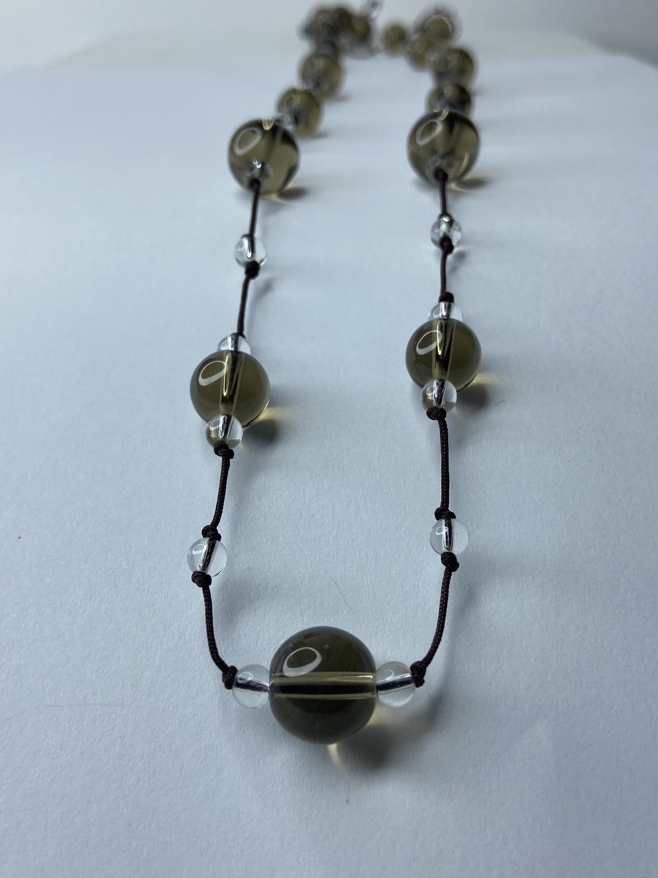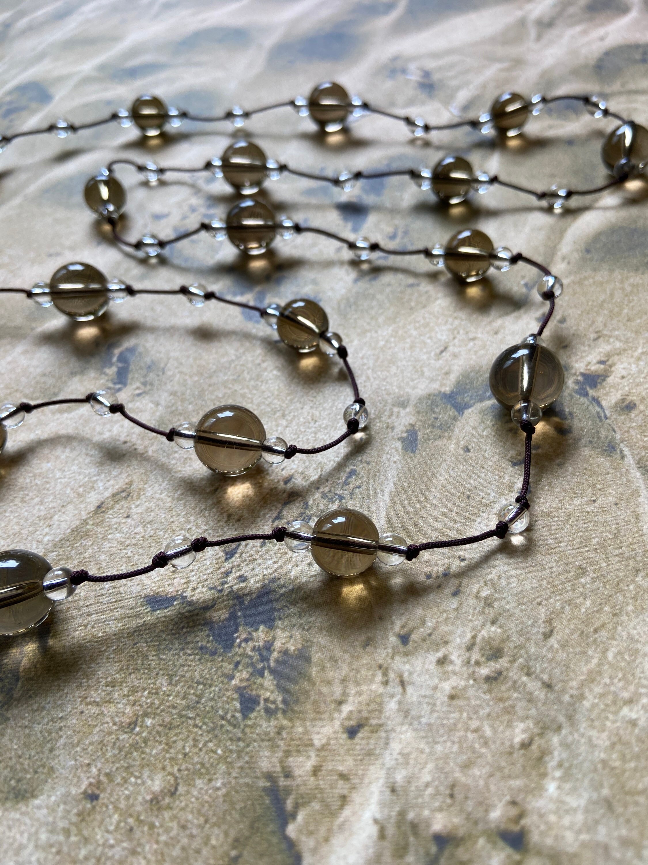 This carefully hand knotted necklace has smoky quartz and clear quartz beads knotted into place.